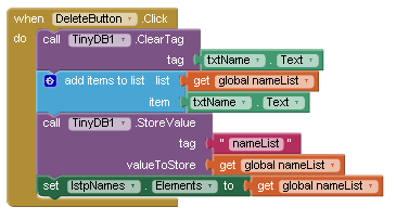 to change what is in the ListPicker, you have to change lstpNames.Elements to reflect the tags in the TinyDB. You can get a list of the current TinyDB tags using the TinyDB1.GetTags block. Your ListPicker will not update unless you tell it to In the code you show, when you add items to list.... block as you do, what you are doing is putting the tag you just deleted back into the List ...don't you think so.... remove that block and see what happens Apex. You do not want to add to the listpicker, you want to DELETE txtName from the global nameList perhaps?