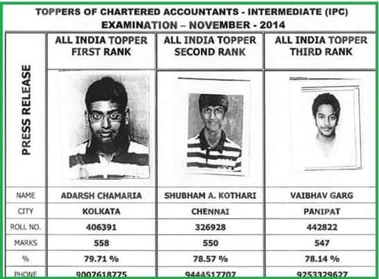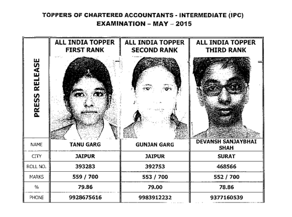 . CA IPCC Topper For May 2015 are given below for kind reference . CA IPCC Topper ForĀ NOV 2014Ā are given below for kind reference . CA IPCC Topper For May 2014Ā are given below for kind reference . CA IPCC Topper ForĀ NOVĀ 2013Ā are given below for kind reference . The most common things between CA IPCC Topper interview are given below: ā