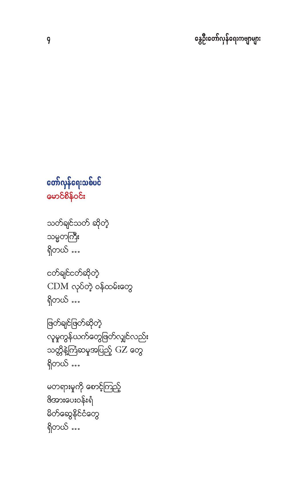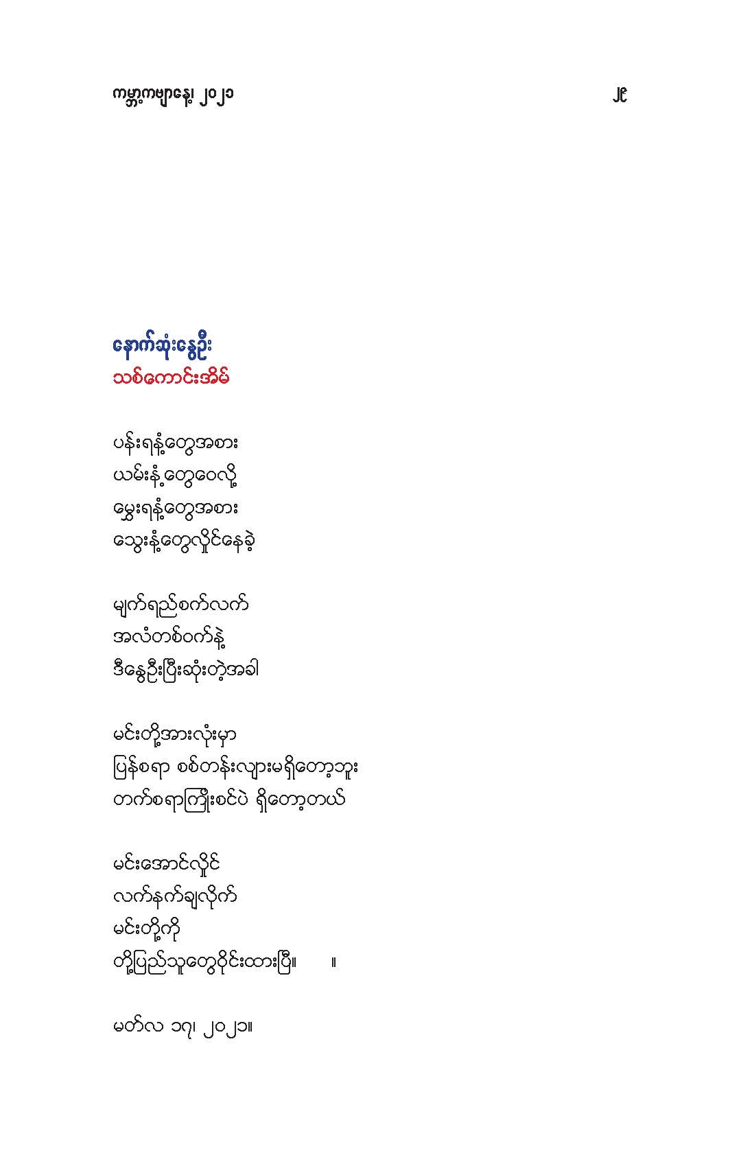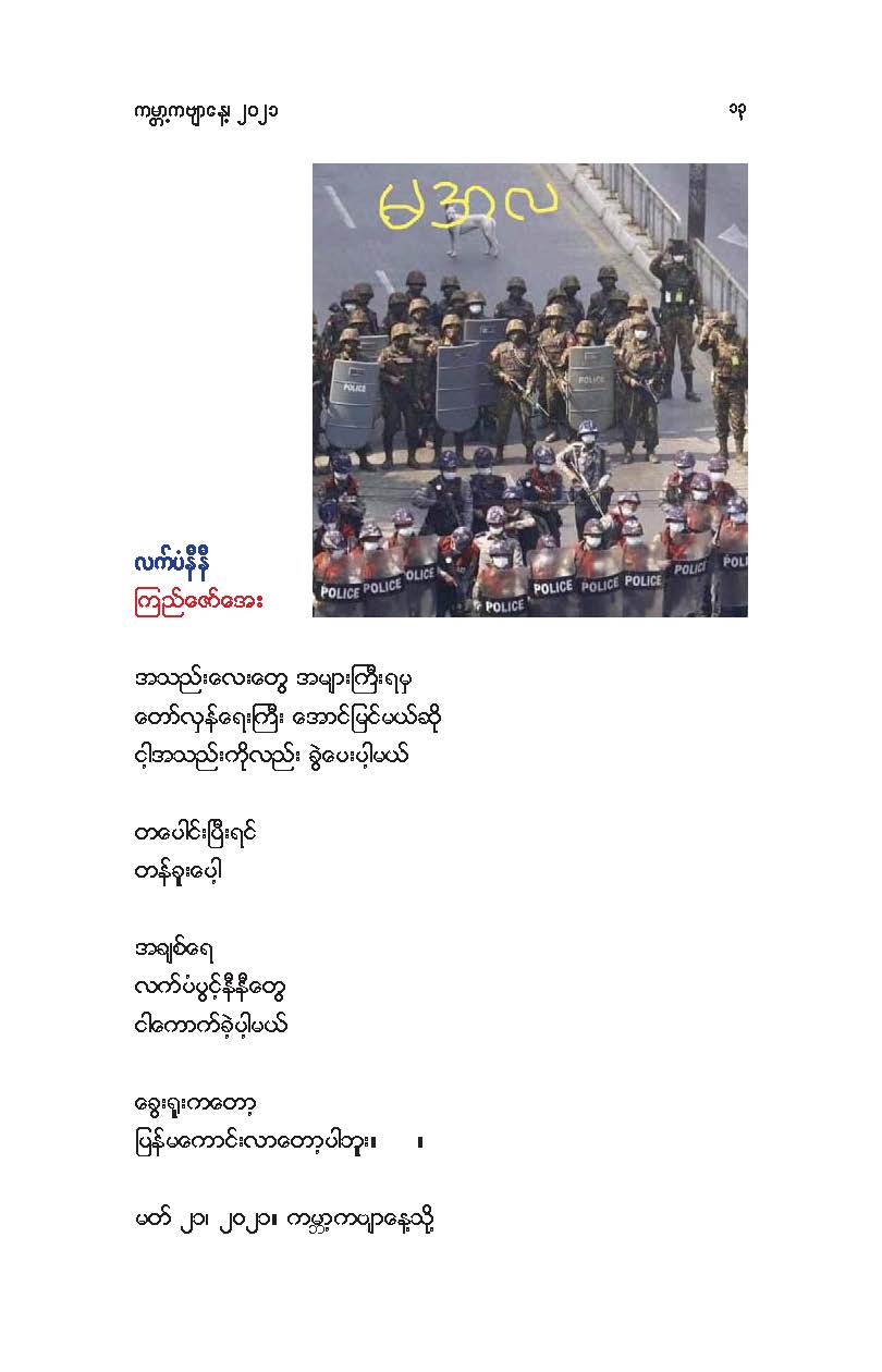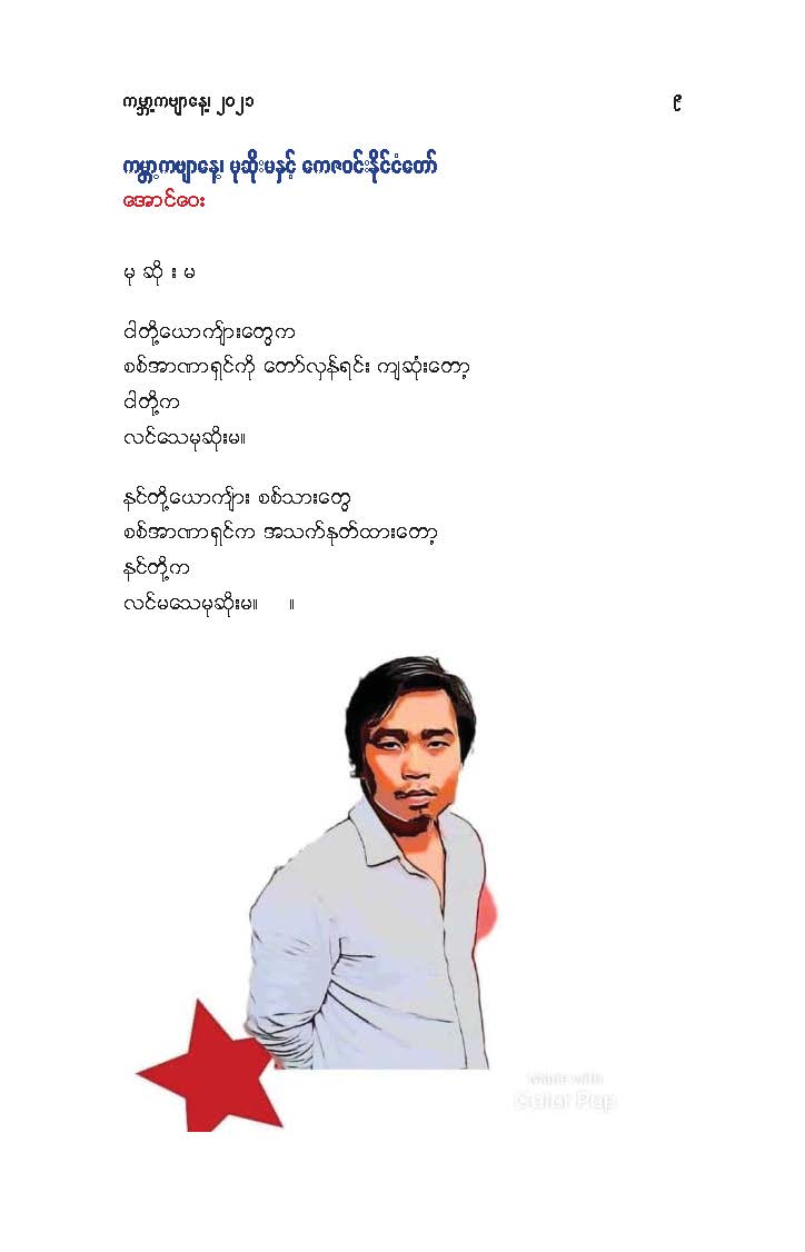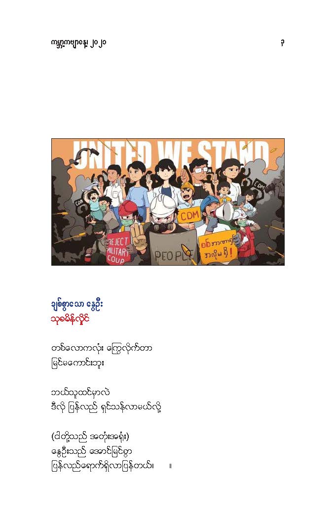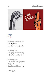 မိုးမခ- မတ် ၂၁ ရက် ကမ္ဘာ ကဗျာနေ့အထိမ်းအမှတ်(အောင်ဝေး၊ ကိုရွေး၊ ဝင်းမြင့်၊ ခင်လွန်း တို့၏ ကဗျာများ) Posted: 21 Mar 2021 03:48 PM PDT မတ် ၂၁ ရက် ကမ္ဘာ ကဗျာနေ့အထိမ်းအမှတ် အောင်ဝေး၊ ကိုရွေး၊ ဝင်းမြင့်၊ ခင်လွန်း တို့၏ ကဗျာများ ကမ္ဘာ့ ကဗျာနေ့ ၊ မုဆိုးမ နှင့် ကေဇဝင်းနိုင်ငံတော် အောင်ဝေး မု ဆိုး မ ငါတို့ယောကျ်ားတွေက စစ်အာဏာရှင်ကို တော်လှန်ရင်း ကျဆုံးတော့ ငါတို့က လင်သေမုဆိုးမ။ နင်တို့ယောကျ်ား စစ်သားတွေ စစ်အာဏာရှင်က အသက်နုတ်ထားတော့ နင်တို့က လင်မသေမုဆိုးမ။ ။ ဒီနေ့ ကမ္ဘာ့ကဗျာနေ့ (World Poetry day) မှာ မြန်မာ့နွေဦးတော်လှန်ရေး(The Spring Revolution) အတွက် "မုဆိုးမ" ကဗျာကို ထည့်ဝင်ပါတယ်။ နိုင်ငံတော်ဆိုတာ ပြည်သူရဲ့ဒုတိယအမည်နာမ။ ပြည်သူက အာဏာအပ်နှင်းရင် အစိုးရ။ ကဗျာဆရာတွေဟာ အဲဒီ နိုင်ငံတော်အစိုးရကို ရွတ်ဆိုသီကျူးပြနိုင်တဲ့ နောက်ထပ် နိုင်ငံတော်အစိုးရ။ လက်ငင်းမှာ နိုင်ငံတော်ဟာ စစ်ခွေးတွေ ၀ိုင်းဆွဲတာ ခံနေရတယ်။ အစိုးရက အာဏာ အလုခံထားရတယ်။ လက်နက်မဲ့ အပြစ်မဲ့ပြည်သူတွေ အသတ်ခံနေရ အဖမ်းခံနေရတယ်။ စစ်အာဏာရှင်ဆန့်ကျင်ရေးတိုက်ပွဲမှာ ပြည်သူတွေနဲ့အတူ ကဗျာဆရာတွေလည်း ပါဝင်တိုက်ခိုက်နေကြတယ်။ စစ်တပ်နဲ့ရဲက ကဗျာဆရာတွေကို သတ်တယ် ဒါပေမဲ့ ကဗျာကိုတော့ သတ်လို့မရဘူး။ စစ်တပ်နဲ့ရဲက ကဗျာဆရာတွေကို ဖမ်းတယ် ဒါပေမဲ့ ကဗျာကိုတော့ ဖမ်းလို့မရဘူး။ ရဲဘော်ကဗျာဆရာအပေါင်းတို့ .... ငါတို့မှာ လက်နက်မရှိ ဆိုပြီး အားမငယ်ပါနဲ့။ ကဗျာဟာ ငါတို့ရဲ့ အထက်မြက်ဆုံးလက်နက်ပဲ။ ကဗျာလက်နက်ကို မြဲမြဲဆုပ်ကိုင်ပြီး စစ်အာဏာရှင်ကို ဆက်တိုက်ကြမယ်။ ကျဆုံးသွားတဲ့ ငါတို့ရဲဘော်ကဗျာဆရာတွေအတွက် ငါတို့ ဆက်တိုက်ကြမယ်။ အဖမ်းခံထားရတဲ့ ငါတို့ရဲဘော်ကဗျာဆရာတွေအတွက် ငါတို့ ဆက်တိုက်ကြမယ်။ နောက်မဆုတ်တမ်း။ အကြမ်းမဖက်တဲ့ အကြမ်းဖက်မှု(Non-violence violence) နဲ့ ငါတို့ရဲ့ စစ်အာဏာရှင်ဆန့်ကျင်ခုခံရေး မဟာစစ်ပွဲ ဆက် ဆင်နွှဲကြမယ်။ ကဗျာလက်နက်၊ တို့လက်နက်။ အာဏာသိမ်းစစ်အုပ်စု မုချကျရှုံးရမယ်။ ကေဇဝင်းနိုင်ငံတော် အဓွန့်ရှည်ပါစေ။ ကြည်လင်အေးနိုင်ငံတော် အဓန့်ရှည်ပါစေ။ ။ (မတ် ၂၁၊ ၂၀၂၁) .... နွေ_ဦး_ဝတ်_စုံ ကိုရွေး ထူးခြားတဲ့အနံ့အသက်ထဲမှာ ရရာခဲနဲ့ကောက်ထုတယ် ကြုံရာကျည်ဆံနဲ့ကျဆုံးတယ် ကြွေမယ်မှန်းသိလည်း မုန်တိုင်းထဲရဲရဲပွင့်ခဲ့တယ် ဒါဟာ ကြည်လင်တဲ့မနက်ဖြန်အတွက်ပဲ တန်ဖိုးကြီးတဲ့ ဒီသင်ခန်းစာမှာ ကျည်ဆံကို ဘယ်လိပ်စာပေးရမလဲ နွေဦးကို ဘယ်ဝတ်စုံနဲ့ ကြိုမလဲ ငါတို့ရခဲ့ပြီ ဒီနွေဦးမှာ ဘယ်သီချင်းကိုဆိုမလဲ ဘယ်ကဗျာကိုရေးမလဲ ငါတို့ ရခဲ့ပြီ ကျောက်ဆောင်ကိုလှိုင်းတလုံးတည်းကဖြိုခဲ့တာမဟုတ်ဘူး နံရံကို အုတ်တချပ်တည်းနဲ့တည်ဆာက်ခဲ့တာမဟုတ်ဘူး ငါတို့ရခဲ့ပြီ ကဗျာဟာနွေဦးတောင်ကုန်းကိုသိမ်းပြီး အလံနက်ကိ