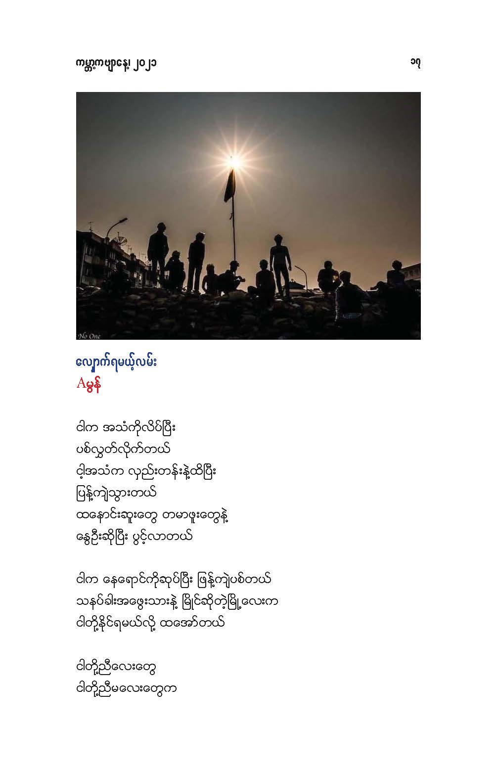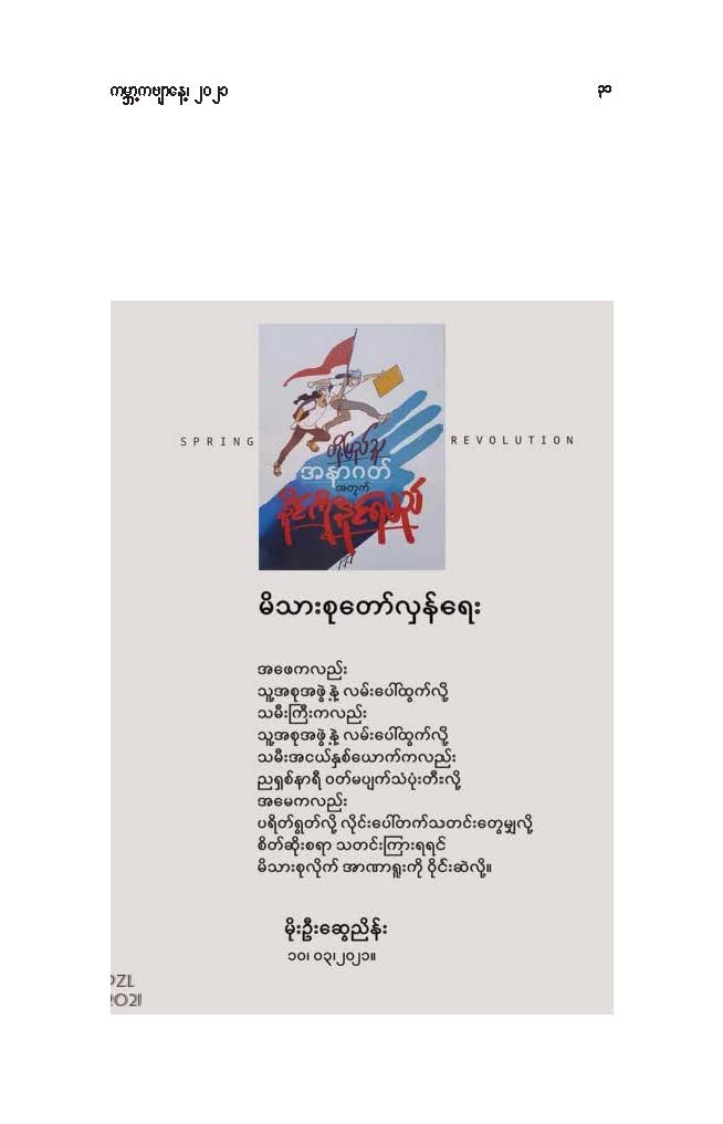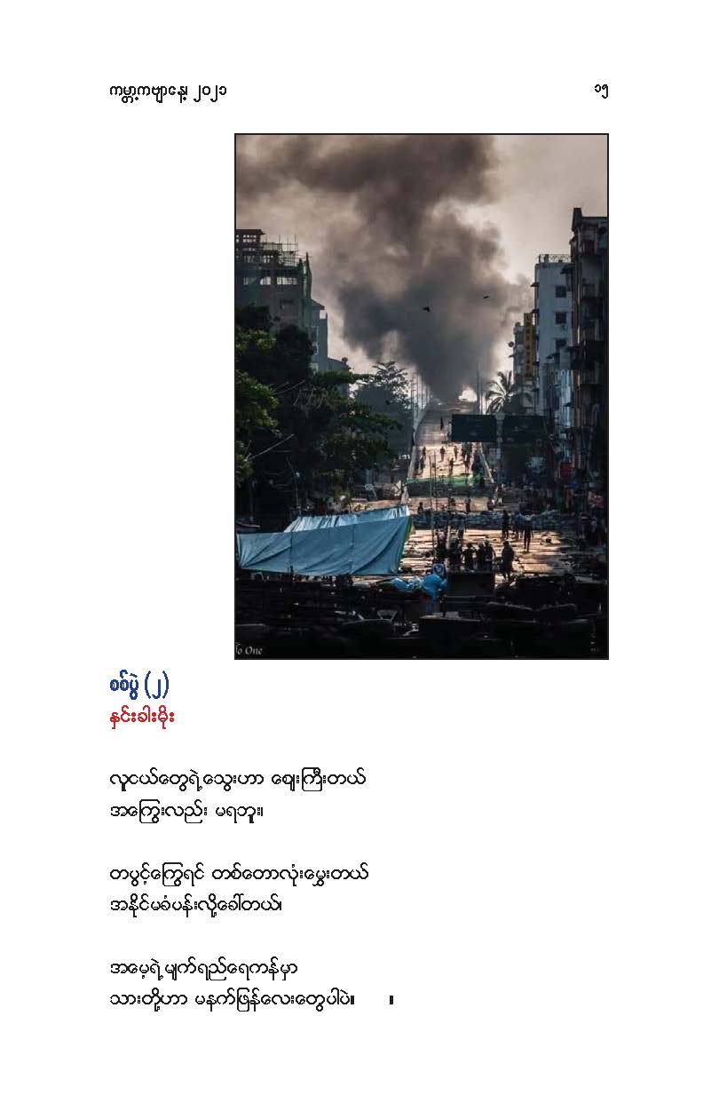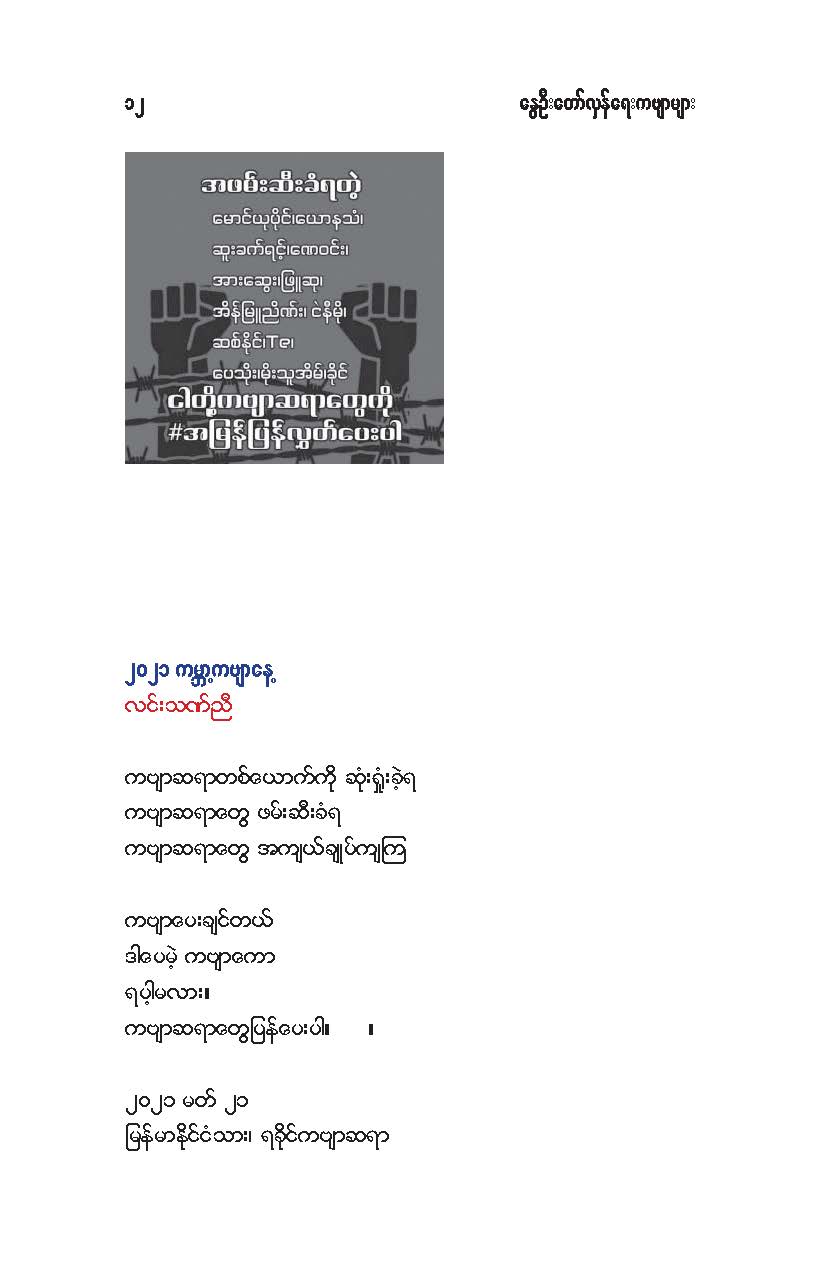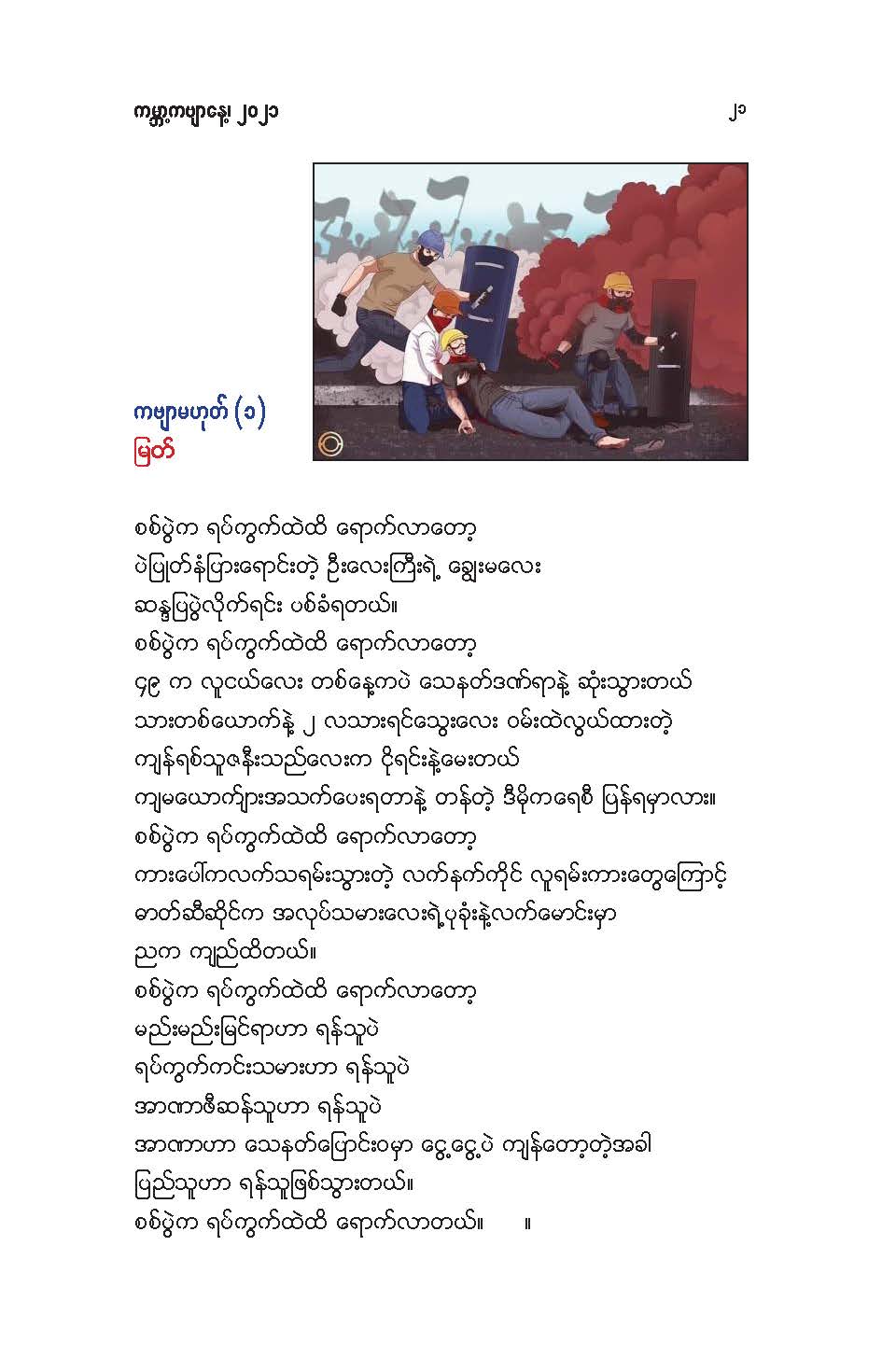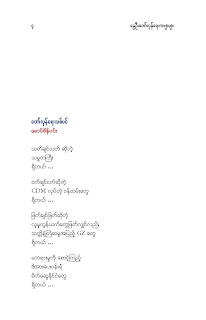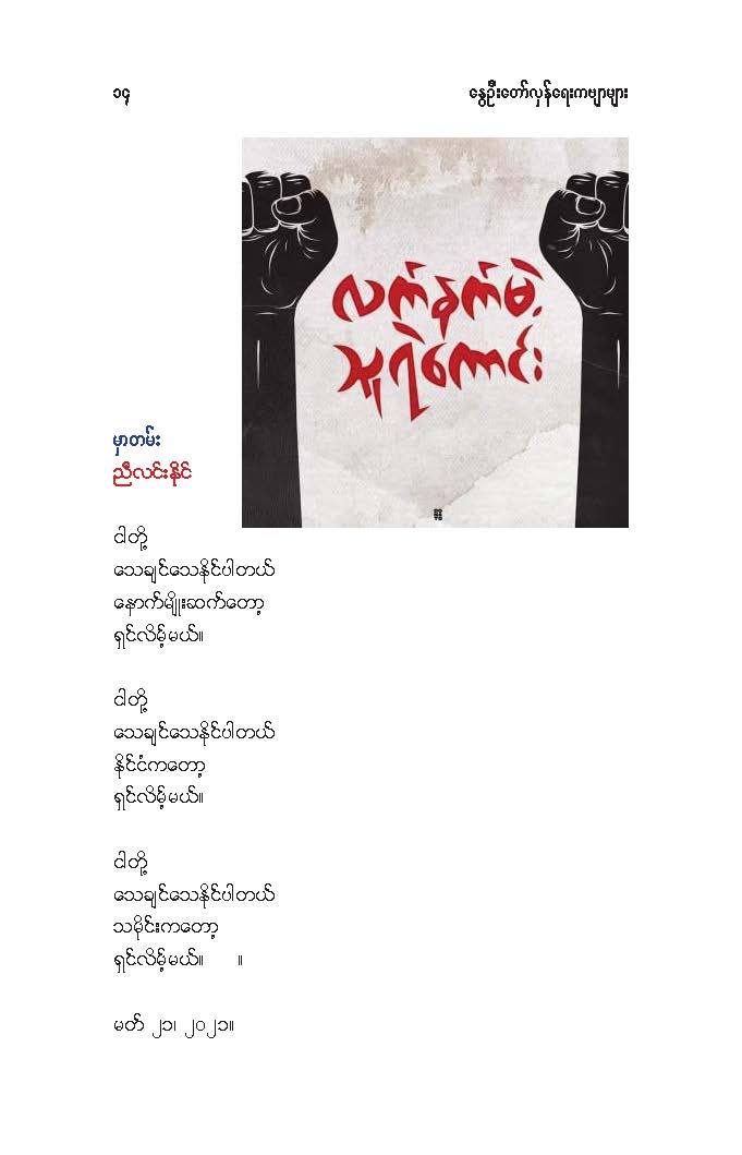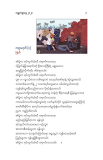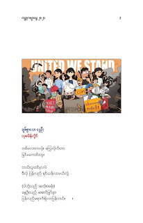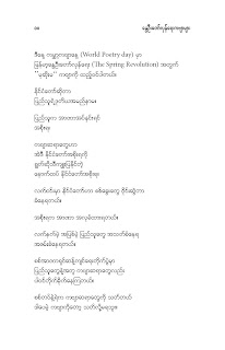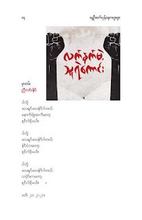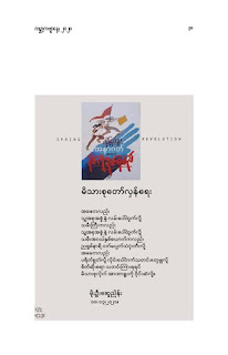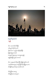 နွေဦးတော်လှန်ရေးကဗျာများ အီးဘုတ် - မိုးဦးဆွေညိန်း စီစဉ်ထုတ်ဝေ Posted: 21 Mar 2021 03:45 PM PDT နွေဦးတော်လှန်ရေးကဗျာများ အီးဘုတ် - မိုးဦးဆွေညိန်း စီစဉ်ထုတ်ဝေ (မိုးမခ) မတ် ၂၁၊ ၂၀၂၁ နွေဦးတော်လှန်ရေးကဗျာများ ၊ ကမ္ဘာ့ကဗျာနေ့၊ ၂၀၂၁၊ အမှတ်တရအဖြစ် မိုးဦးဆွေညိန်းက စီစဉ်ထုတ်ဝေပါတယ်။ ခွင့်ပြုချက်ကြိုတင်တောင်းခံနိုင်ခြင်းမရှိဘဲ အမြန်ဆုံး ကဗျာချစ်သူများ တော်လှန်ရေးတိုက်ပွဲဝင်နေသူများအတွက် ခွန်အားတစုံတရာ ထည့်ဝင်ခြင်း ဖြစ်ပါတယ်။ ခွင့်ပြုကြစေလိုပါတယ်။ ဆက်ပြီး နွေဦးတော်လှန်ရေးကဗျာများ ကမ္ဘာ့ကဗျာနေ့၊ ၂၀၂၁ ၁။ သုခမိန်လှိုင် ၂။ မောင်စိန်ဝင်း(ပုတီးကုန်း) ၃။ ဇေယျာလင်း ၄။ အောင်ဝေး ၅။ လင်းသဏ်ညီ ၆။ ကြည်ဇော်အေး ၇။ ညီလင်းနိုင် ၈။ နှင်းခါးမိုး ၉။ အေဖော်ခိုင် ၁၀။ ဗမွန် ၁၁။ ကိုရွေး ၁၂။ မြတ် ၁၃။ မိုးကျော်သူ ၁၄။ ကေဇဝင်း ၁၅။ မင်းနဒီခ ၁၆။ နီဟိန်းမော် ၁၇။ မိုးဝေး ၁၈။ သစ်ကောင်းအိမ် ၁၉။ ဝင်းမြင့် ၂၀။ မိုးဦးဆွေညိန်း နွေဦးတော်လှန်ရေးကဗျာများ ၂၀၂၁ ကမ္ဘာ့ကဗျာနေ့ဟာ ကျနောတို့ရဲ့ မပြီးသေးတဲ့ တော်လှန်ရေးနေ့ရက်များထဲမှာ ကြုံရတာကြောင့် နွေဦးတော် လှန်ရေးကို အကြောင်းပြုထားတဲ့ ကဗျာများကို ဘယ်သူ့ဆီကမှ တောင်းမထားဘဲ လက်လှမ်းမီသ၍ စုစည်းဖြစ်ပါတယ်။ တစ်စုတစ်တည်း ဖတ်ရအောင် PDF ဖိုင် ပြုလုပ်ပြီးတင်ပေးထားပါတယ်။ ပါဝင်သောကဗျာဆရာများနှင့် သရုပ်ဖော်ပုံအဖြစ် သုံးထားတဲ့ ပုံများ၏ မူလပိုငရှင် များကလည်း တော်လှန်ရေးအတွက် နိုင်တဲ့ဘက်က ထည့်ဝင်သယ်ပိုးခြင်းအဖြစ် နားလည်ပေးမယ်လို့ ယုံကြည်ပါတယ်။ ချွတ်ချော်မှုတစ်စုံတစ်ရာ ရှိခဲ့ရင်လည်း စီစဉ်သူ ကျနော့်ကို ခွင့်လွှတ်နားလည်ပေးဖို့ တောင်းပန်အပ်ပါတယ်။ စီစဉ်သူ မိုးဦးဆွေညိန်း မတ် ၂၁၊ ၂၀၂၁။ ဒေါင်းလုပ်လင့် - https://drive.google.com/.../1R0u1GkrNKdpX7RVTGML.../view... |