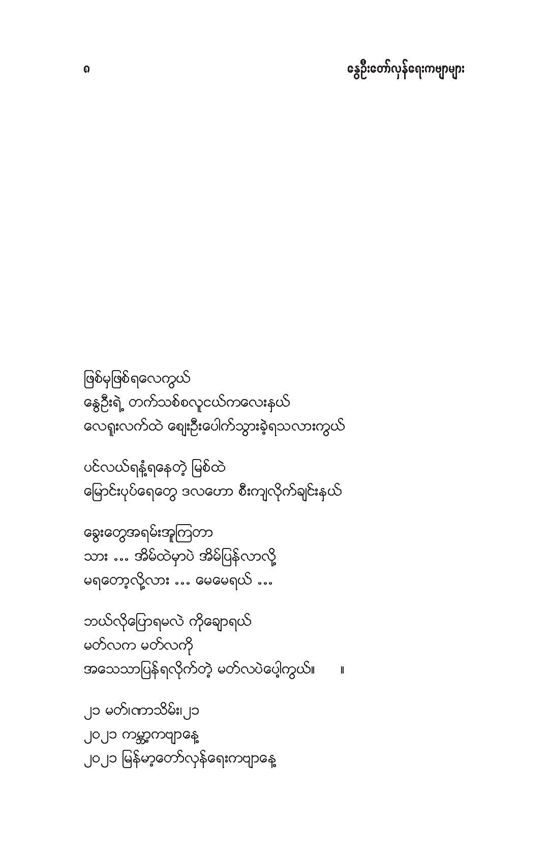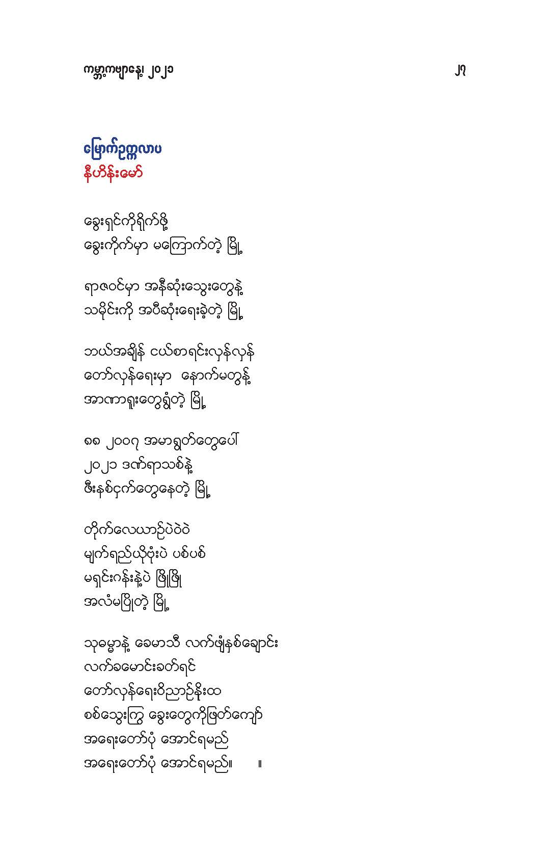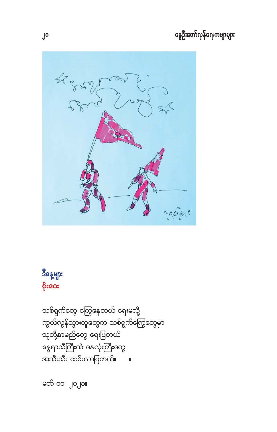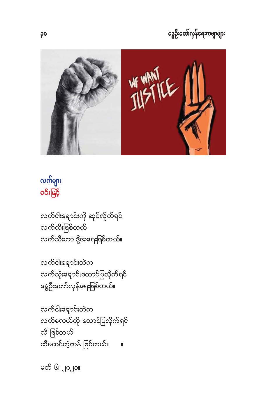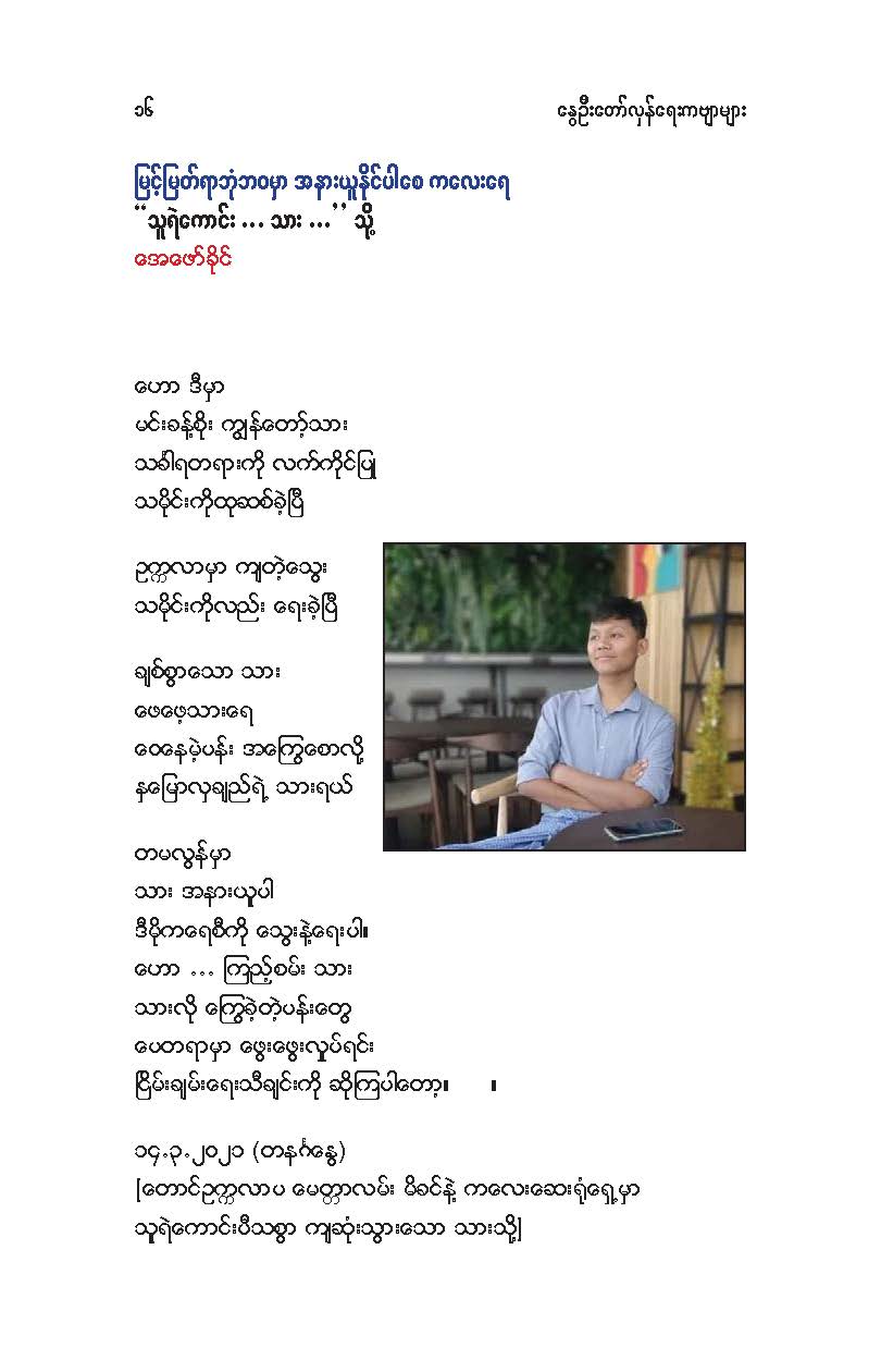 နွေဦးတော်လှန်ရေးကဗျာများ အီးဘုတ် - မိုးဦးဆွေညိန်း စီစဉ်ထုတ်ဝေ Posted: 21 Mar 2021 03:45 PM PDT နွေဦးတော်လှန်ရေးကဗျာများ အီးဘုတ် - မိုးဦးဆွေညိန်း စီစဉ်ထုတ်ဝေ (မိုးမခ) မတ် ၂၁၊ ၂၀၂၁ နွေဦးတော်လှန်ရေးကဗျာများ ၊ ကမ္ဘာ့ကဗျာနေ့၊ ၂၀၂၁၊ အမှတ်တရအဖြစ် မိုးဦးဆွေညိန်းက စီစဉ်ထုတ်ဝေပါတယ်။ ခွင့်ပြုချက်ကြိုတင်တောင်းခံနိုင်ခြင်းမရှိဘဲ အမြန်ဆုံး ကဗျာချစ်သူများ တော်လှန်ရေးတိုက်ပွဲဝင်နေသူများအတွက် ခွန်အားတစုံတရာ ထည့်ဝင်ခြင်း ဖြစ်ပါတယ်။ ခွင့်ပြုကြစေလိုပါတယ်။ ဆက်ပြီး နွေဦးတော်လှန်ရေးကဗျာများ ကမ္ဘာ့ကဗျာနေ့၊ ၂၀၂၁ ၁။ သုခမိန်လှိုင် ၂။ မောင်စိန်ဝင်း(ပုတီးကုန်း) ၃။ ဇေယျာလင်း ၄။ အောင်ဝေး ၅။ လင်းသဏ်ညီ ၆။ ကြည်ဇော်အေး ၇။ ညီလင်းနိုင် ၈။ နှင်းခါးမိုး ၉။ အေဖော်ခိုင် ၁၀။ ဗမွန် ၁၁။ ကိုရွေး ၁၂။ မြတ် ၁၃။ မိုးကျော်သူ ၁၄။ ကေဇဝင်း ၁၅။ မင်းနဒီခ ၁၆။ နီဟိန်းမော် ၁၇။ မိုးဝေး ၁၈။ သစ်ကောင်းအိမ် ၁၉။ ဝင်းမြင့် ၂၀။ မိုးဦးဆွေညိန်း နွေဦးတော်လှန်ရေးကဗျာများ ၂၀၂၁ ကမ္ဘာ့ကဗျာနေ့ဟာ ကျနောတို့ရဲ့ မပြီးသေးတဲ့ တော်လှန်ရေးနေ့ရက်များထဲမှာ ကြုံရတာကြောင့် နွေဦးတော် လှန်ရေးကို အကြောင်းပြုထားတဲ့ ကဗျာများကို ဘယ်သူ့ဆီကမှ တောင်းမထားဘဲ လက်လှမ်းမီသ၍ စုစည်းဖြစ်ပါတယ်။ တစ်စုတစ်တည်း ဖတ်ရအောင် PDF ဖိုင် ပြုလုပ်ပြီးတင်ပေးထားပါတယ်။ ပါဝင်သောကဗျာဆရာများနှင့် သရုပ်ဖော်ပုံအဖြစ် သုံးထားတဲ့ ပုံများ၏ မူလပိုငရှင် များကလည်း တော်လှန်ရေးအတွက် နိုင်တဲ့ဘက်က ထည့်ဝင်သယ်ပိုးခြင်းအဖြစ် နားလည်ပေးမယ်လို့ ယုံကြည်ပါတယ်။ ချွတ်ချော်မှုတစ်စုံတစ်ရာ ရှိခဲ့ရင်လည်း စီစဉ်သူ ကျနော့်ကို ခွင့်လွှတ်နားလည်ပေးဖို့ တောင်းပန်အပ်ပါတယ်။ စီစဉ်သူ မိုးဦးဆွေညိန်း မတ် ၂၁၊ ၂၀၂၁။ ဒေါင်းလုပ်လင့် - https://drive.google.com/.../1R0u1GkrNKdpX7RVTGML.../view... |