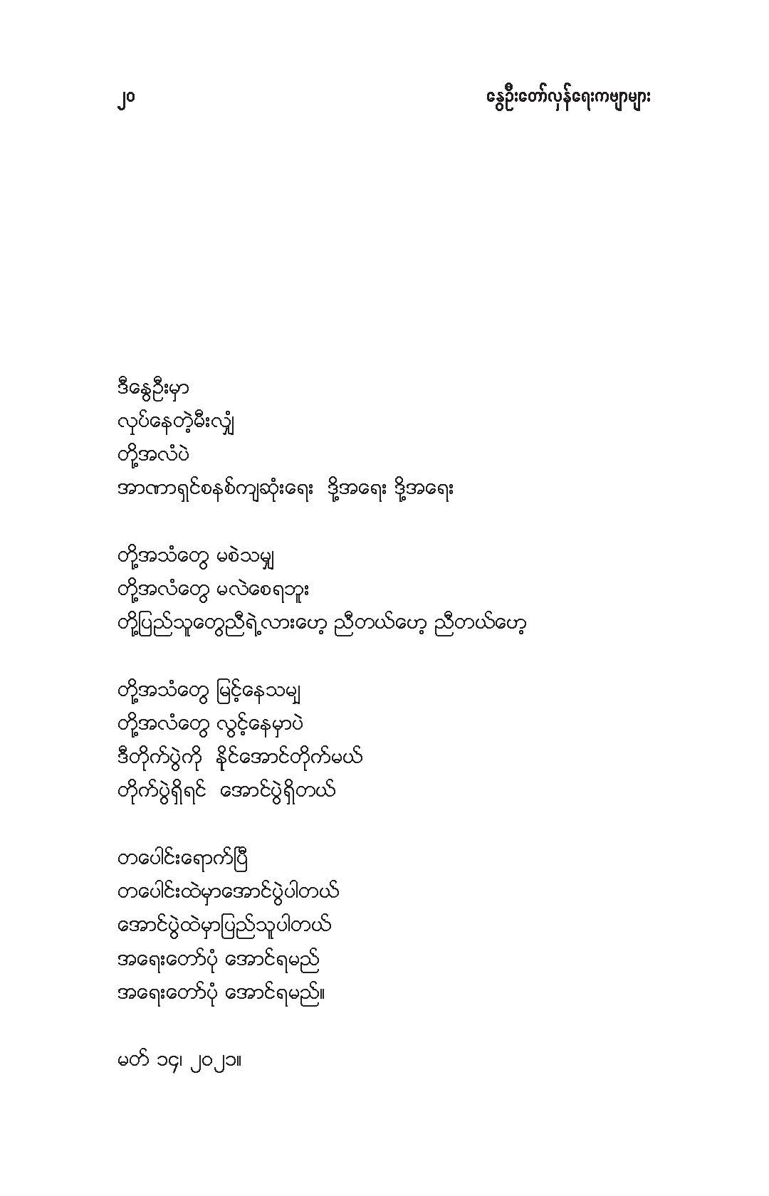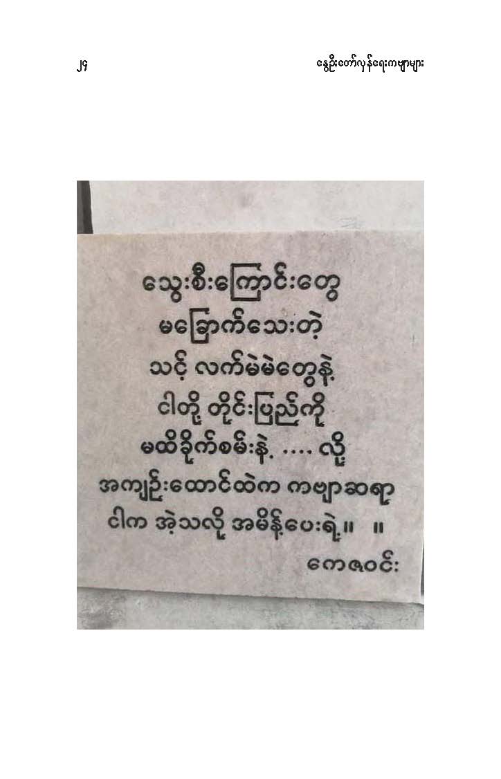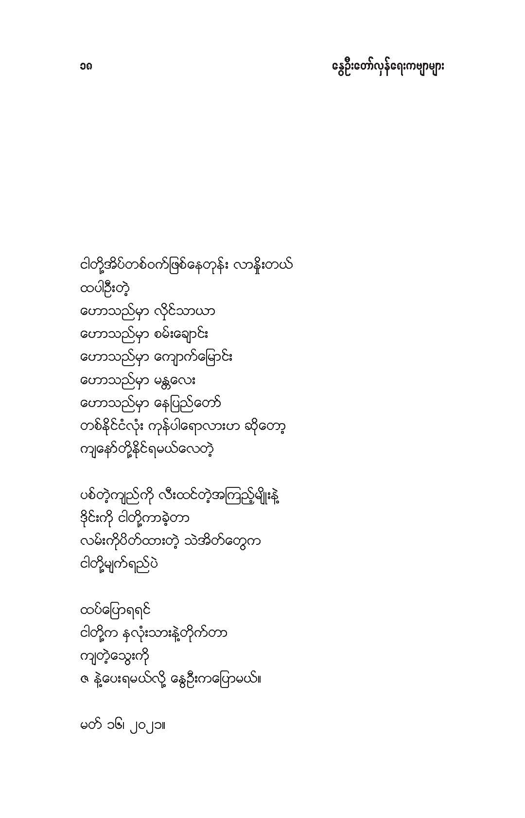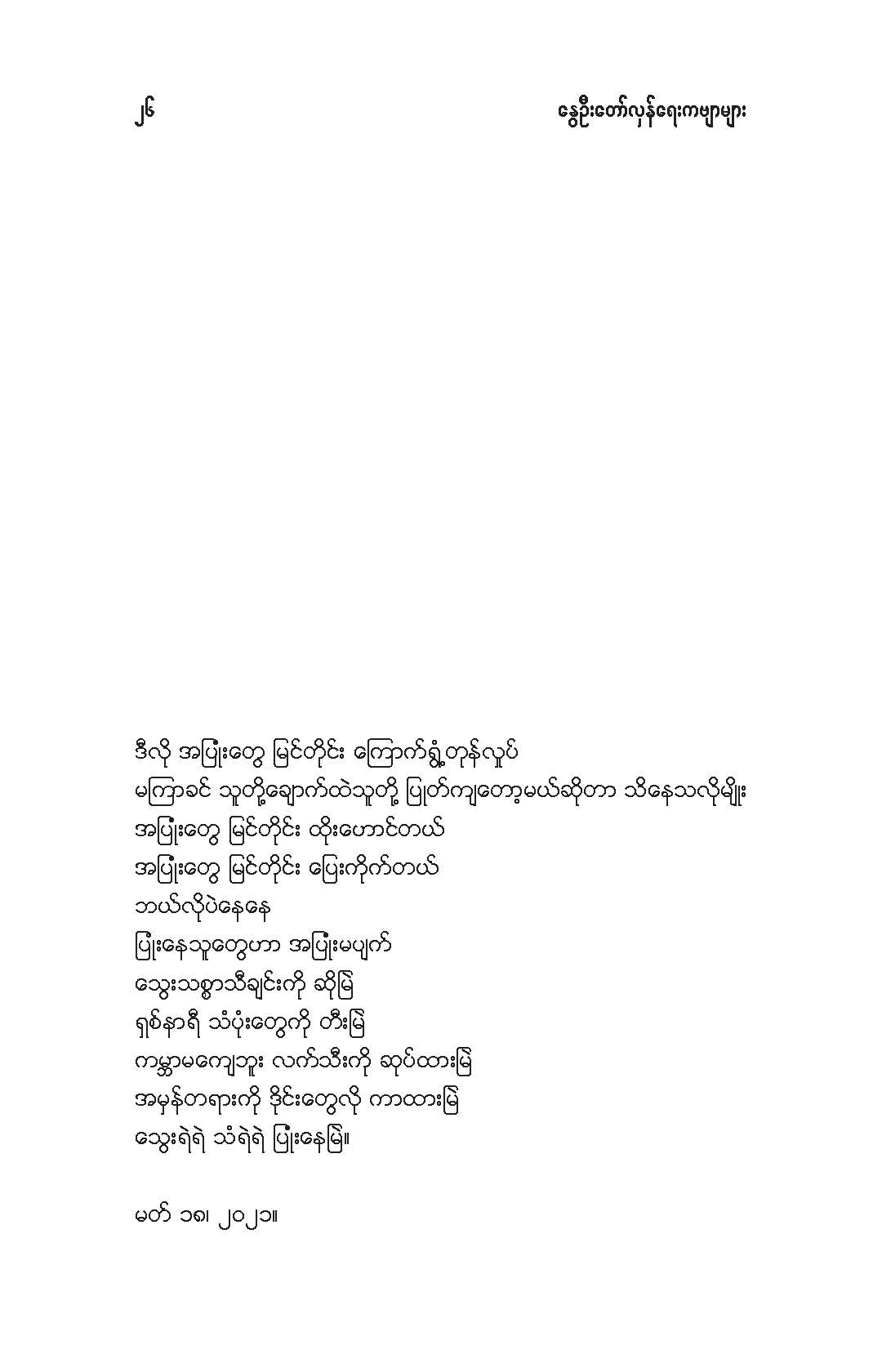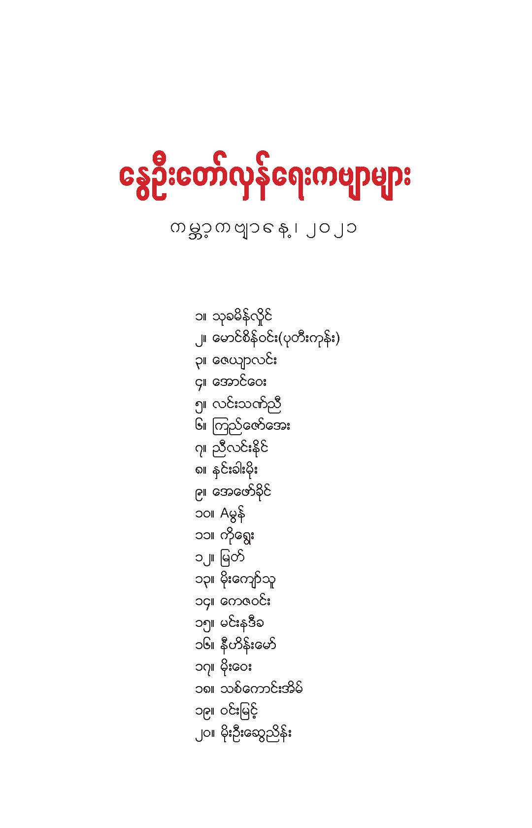 နွေဦးတော်လှန်ရေးကဗျာများ အီးဘုတ် - မိုးဦးဆွေညိန်း စီစဉ်ထုတ်ဝေ Posted: 21 Mar 2021 03:45 PM PDT နွေဦးတော်လှန်ရေးကဗျာများ အီးဘုတ် - မိုးဦးဆွေညိန်း စီစဉ်ထုတ်ဝေ (မိုးမခ) မတ် ၂၁၊ ၂၀၂၁ နွေဦးတော်လှန်ရေးကဗျာများ ၊ ကမ္ဘာ့ကဗျာနေ့၊ ၂၀၂၁၊ အမှတ်တရအဖြစ် မိုးဦးဆွေညိန်းက စီစဉ်ထုတ်ဝေပါတယ်။ ခွင့်ပြုချက်ကြိုတင်တောင်းခံနိုင်ခြင်းမရှိဘဲ အမြန်ဆုံး ကဗျာချစ်သူများ တော်လှန်ရေးတိုက်ပွဲဝင်နေသူများအတွက် ခွန်အားတစုံတရာ ထည့်ဝင်ခြင်း ဖြစ်ပါတယ်။ ခွင့်ပြုကြစေလိုပါတယ်။ ဆက်ပြီး နွေဦးတော်လှန်ရေးကဗျာများ ကမ္ဘာ့ကဗျာနေ့၊ ၂၀၂၁ ၁။ သုခမိန်လှိုင် ၂။ မောင်စိန်ဝင်း(ပုတီးကုန်း) ၃။ ဇေယျာလင်း ၄။ အောင်ဝေး ၅။ လင်းသဏ်ညီ ၆။ ကြည်ဇော်အေး ၇။ ညီလင်းနိုင် ၈။ နှင်းခါးမိုး ၉။ အေဖော်ခိုင် ၁၀။ ဗမွန် ၁၁။ ကိုရွေး ၁၂။ မြတ် ၁၃။ မိုးကျော်သူ ၁၄။ ကေဇဝင်း ၁၅။ မင်းနဒီခ ၁၆။ နီဟိန်းမော် ၁၇။ မိုးဝေး ၁၈။ သစ်ကောင်းအိမ် ၁၉။ ဝင်းမြင့် ၂၀။ မိုးဦးဆွေညိန်း နွေဦးတော်လှန်ရေးကဗျာများ ၂၀၂၁ ကမ္ဘာ့ကဗျာနေ့ဟာ ကျနောတို့ရဲ့ မပြီးသေးတဲ့ တော်လှန်ရေးနေ့ရက်များထဲမှာ ကြုံရတာကြောင့် နွေဦးတော် လှန်ရေးကို အကြောင်းပြုထားတဲ့ ကဗျာများကို ဘယ်သူ့ဆီကမှ တောင်းမထားဘဲ လက်လှမ်းမီသ၍ စုစည်းဖြစ်ပါတယ်။ တစ်စုတစ်တည်း ဖတ်ရအောင် PDF ဖိုင် ပြုလုပ်ပြီးတင်ပေးထားပါတယ်။ ပါဝင်သောကဗျာဆရာများနှင့် သရုပ်ဖော်ပုံအဖြစ် သုံးထားတဲ့ ပုံများ၏ မူလပိုငရှင် များကလည်း တော်လှန်ရေးအတွက် နိုင်တဲ့ဘက်က ထည့်ဝင်သယ်ပိုးခြင်းအဖြစ် နားလည်ပေးမယ်လို့ ယုံကြည်ပါတယ်။ ချွတ်ချော်မှုတစ်စုံတစ်ရာ ရှိခဲ့ရင်လည်း စီစဉ်သူ ကျနော့်ကို ခွင့်လွှတ်နားလည်ပေးဖို့ တောင်းပန်အပ်ပါတယ်။ စီစဉ်သူ မိုးဦးဆွေညိန်း မတ် ၂၁၊ ၂၀၂၁။ ဒေါင်းလုပ်လင့် - https://drive.google.com/.../1R0u1GkrNKdpX7RVTGML.../view... |