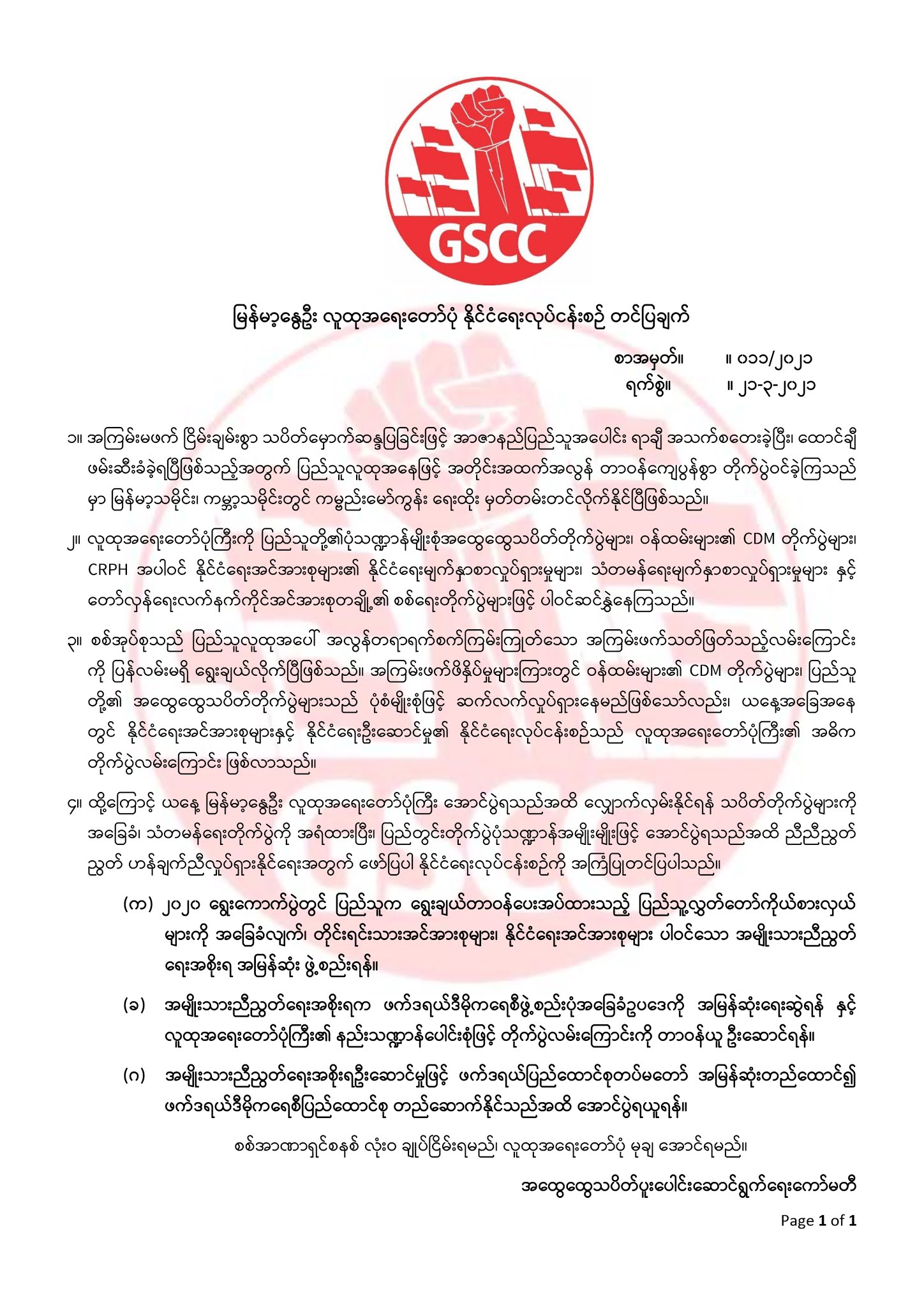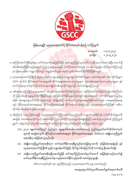 GSCC အထွေထွေသပိတ်ပူးပေါင်းဆောင်ရွက်ရေးကော်မတီက နိုင်ငံရေးလုပ်ငန်းစဉ် တင်ပြ Posted: 21 Mar 2021 12:48 AM PDT GSCC အထွေထွေသပိတ်ပူးပေါင်းဆောင်ရွက်ရေးကော်မတီက နိုင်ငံရေးလုပ်ငန်းစဉ် တင်ပြ(မိုးမခ) မတ် ၂၁၊ ၂၀၂၁၂၀၂၁ ဖေဖော်ဝါရီ နွေဦးတော်လှန်ရေးအတွင်း သပိတ်အဖွဲ့များနဲ့ ချိတ်ဆက်ထားသည့် အထွေထွေသပိတ်ပူးပေါင်းဆောင်ရွက်ရေးကော်မီတီက စာအမှတ် ၁၁၊ (မတ် ၂၁) ထုတ်ပြန်ချက်အရ - (၁) ၂၀၂၀ ရွေးကောက်ပွဲနိုင် ကိုယ်စားလှယ်များ၊ တိုင်းရင်းသားအင်အားစုများနှင့် နိုင်ငံရေးအင်အားစုများပါဝင်သော အမျိုးသားညီညွတ်ရေးအစိုးရကို အမြန်ဆုံး ဖွဲ့စည်းရန်၊ (၂) ဖယ်ဒရယ်ဒီမိုကရေစီ ဖွဲ့စည်းပုံ အခြေခံဥပဒေအမြန်ဆုံးရေးဆွဲရန်၊ အရေးတော်ပုံ တိုက်ပွဲကို ဦးဆောင်ရန်၊ (၃) ဖယ်ဒရယ်တပ်မတော် အမြန်ဆုံးထူထောင်၍ အောင်ပွဲရသည်အထိ ဆောင်ရွက်ရန် တိုက်တွန်းထားသည်။ လက်ရှိအခြေအနေတွင် CRPH ဥိးဆောင်သော ပြည်သူ့လွှတ်တော်ကိုယ်စားလှယ်များက ယာယီဒုသမ္မတ၊ ယာယီဝန်ကြီးများ၊ နိုင်ငံတကာ သံကိုယ်စားလှယ်များနှင့် လည်ပတ်နေပြီး ပြည်တွင်းပြည်ပ အဖွဲ့အစည်းအသီးသိးနှင့်လည်း တွေ့ဆုံဆွေးနွေးညှိနှိုင်းမှုများ ဆောင်ရွက်လျက်ရှိသည်။ တိုင်းရင်းသားအဖွဲ့အစည်းများနှင့်လည်း ညှိနှို်င်းမှုများလည်း ရှိသည်။ လက်ရှိတွင် ဖယ်ဒရယ်ပြည်ထောင်စုဆိုင်ရာအကောင်အထည်ဖော်ဆောင်မှုများအတွက် ၈၀% ပြီးစီးနေပြီဖြစ်ကြောင်း CRPH၏ ယာယီနိုင်ငံခြားရေးဝန်ကြိး ဒေါ်ဇင်မာအောင်က သတင်းဌာနအင်တာဗျူးတခုတွင် ဖြေကြားခဲ့သည်။ အခု ထုတ်ပြန်သော GSCC၏ ထုတ်ပြန်ချက်မှာ CRPH ကို ပြတ်ပြတ်သားသား မြန်မြန်ဆန်ဆန်ဖြင့် ရှေ့က ဦးဆောင်ရန် တိုက်တွန်း ထောက်ခံထားသော သဘောဆောင်သည်ဟု ဆိုနိုင်သည်။ မတ်လ ၅ ရက်နေ့က CRPH ၏ နိုင်ငံရေးရည်မှန်းချက်ထွက်လာပြီးနောက်တွင် ပြည်ထောင်စုတွင်းရှိ အင်အားစုအားလုံးလွှမ်းချုံသော ဖယ်ဒရယ်ဒီမိုကရေစီပြည်ထောင်စု ထူထောင်ရေးသည် အားလုံးအရေးအဖြစ် တော်လှန်ရေးလှိုင်းတဆင့်မြင့်တက်ခဲ့ပြီ ဖြစ်ရာ အမျိုးသားညီညွတ်ရေးအစိုးရ၊ အစိုးရတရပ်၏ တာဝန်ယူမှု ဦးဆောင်မှု၊ ထို့နောက် ဖယ်ဒရယ်အခြေခံဥပဒေ၊ ဖယ်ဒရယ်တပ်မတော်များ ဖြင့် ပြည်ထောင်စုထူထောင်ရန်အတွက် ဆက်ချီတက်ကြရန်ကို မီးမောင်းထိုးပြလိုက်သည်ဟု ဆိုနိုင်သည်။ ၎င်းတို့ထုတ်ပြန်ချက်အပြည့်အစုံကို အောက်မှာ ဖော်ပြလိုက်သည်။ မြန်မာ့နွေဦး လူထုအရေးတော်ပုံ နိုင်ငံရေးလုပ်ငန်းစဉ် တင်ပြချက် စာအမှတ်။ ။ ၀၁၁/၂၀၂၁ ရက်စွဲ။ ။ ၂၁-၃-၂၀၂၁ ၁။ အကြမ်းမဖက် ငြိမ်းချမ်းစွာ သပိတ်မှောက်ဆန္ဒပြခြင်းဖြင့် အာဇာနည်ပြည်သူအပေါင်း ရာချီ အသက်စတေးခဲ့ပြီး၊ ထောင်ချီ ဖမ်းဆီးခံခဲ့ရပြီဖြစ်သည့်အတွက် ပြည်သူလူထုအနေဖြင့် အတိုင်းအထက်အလွန် တာဝန်ကျေပွန်စွာ တိုက်ပွဲဝင်ခဲ့ကြသည် မှာ
