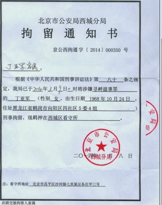 Posted: 24 Mar 2014 04:05 AM PDT (作者:伍立娟) 在“两会”期间的3月9日,黑龙江鹤岗市向阳区四社区5委4组的维权人丁亚军被北京西城分局以“寻衅滋事”刑事拘留,现羁押在西城区看守所。 丁亚军,1968年出生,黑龙江鹤岗市人。因房屋被开发商暴力强拆,多次协商达不成,从2008年开始而走上上访之路,多次关押黑监狱,在惊吓之中导致丁亚军严重心肌病,丁亚军多次逐级上访到北京。 2010年8月28日,被关押北京虎坊路黑监狱; 2011年3月10日,被关押黑监狱3天;2011年3月14日,在120急救车上被截访人员抢下非法拘留10天,差一点导致丁亚军差死亡。复议至今不获受理; 2012年2月24日-3月4日,被关押北京南五环黑监狱10天; 2012年3月4日—3月14日,被非法拘留10天,复议至今不获受理; 2012年3月19日-3月26日,被关押北京南四环黑监狱7天; 2012年3月26日,被地方接回被非法劳教两年,在劳教期间由于丁亚军多次关押黑监狱导致患有心肌病,呼吸困难,在劳教所多次抢救,最后劳教所怕承担死亡责任,要求家人给丁亚军保外就医监外执行一年; 2013年3月2日,丁亚军被保外就医出狱。 2013年,丁亚军带着疾病的身体继续在北京维权,多次被鹤岗市押回,同样任何问题不予解决,围追堵截不让丁上北京,丁多次去中南海被送马家楼,由于丁被劳教的一年变化很大,鹤岗市接访人在不是很认识丁亚军的情况下,在马家楼多次被鹤岗市接访强接被众多访民营救,因此鹤岗市接访人一度曾把湖北维权人伍立娟当成丁亚军,跟踪很久直到伍立娟说话,鹤岗市接访人才知道搞错了,因为南方人说话与北方人说话有很大的区别。 如今当局再次拘留丁亚军是非法的,应该立即释放丁亚军。 此信息由权利运动公民权利项目编辑 |