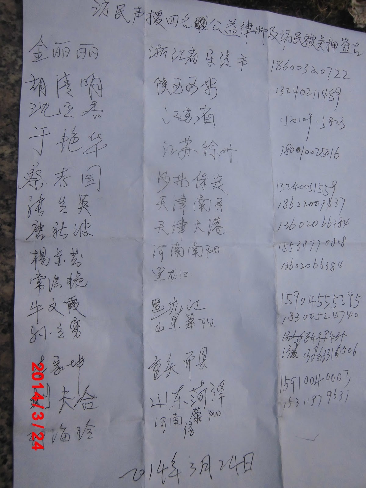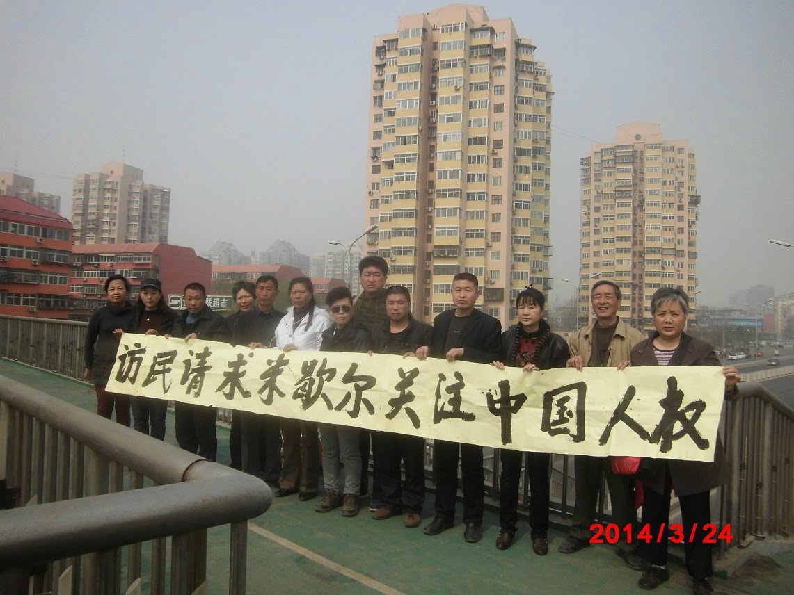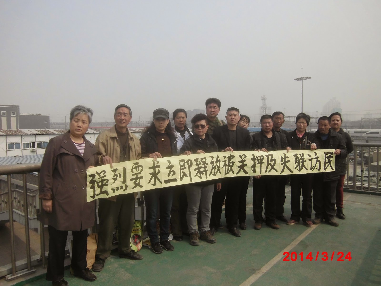Posted: 24 Mar 2014 09:26 AM PDT (2014/3/24)权利运动发布: 今天(3月24日)中午,在京访民蔡志国、张兰英、唐新波、常洪艳、刘夫合、牛文霞、孙立勇、沈立秀等在北京南站拉出大型横幅,要求黑龙江建三江警方立即无条件释放唐吉田、江天勇、张俊杰、王成等四位人权律师,以及被非法关押黑监狱建三江农垦的访民。 2014年3月21日,为了维护法律尊严,抵制践踏人权的黑监狱,唐吉田、江天勇、张俊杰、王成等四位知名维权律师陪同九位被囚黑监狱的当事人亲属,前往位于黑龙江建三江农垦总局青龙山农场的“法制教育基地”黑监狱,要求释放被非法拘禁在此的守法公民,并前往当地检察院依法控告。然而,在晚间回宾馆时遭到不明车辆跟踪后失联。 黑监狱是延续劳教恶法的替代品,在劳教制度还没有废除前,比劳教所更邪恶的黑监狱就已经铺天盖地存在,都是以“法制学习班”、“非法上访训诫中心”等出现的,是不法维稳申请财政拨款的主要途径。 蔡志国电话:13240031559。 张兰英电话:18622009537。常洪艳电话:13602066384。 刘夫合电话:15910040003。 牛文霞电话:15904555395。 孙立勇电话:18300524740。 沈立秀电话:15010913823。 此信息由权利运动公民社会建设项目编辑 |
