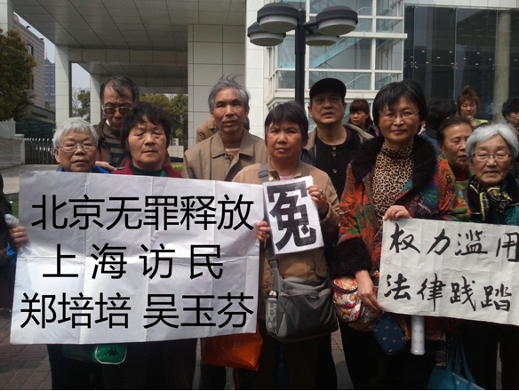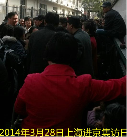 Posted: 30 Mar 2014 07:12 AM PDT (作者:王再明) 星期三是上海访民例行相聚上海市委、市府、市人大、市政协办公所在地的人民大道200号日子,且风雨无阻每周必到,一来互通信息,二来交流维权方式。本周的星期三是一个特殊的日子,除了周而复始倾诉自己的多年未决的诉求外,大家还怀着对3月11日遭北京当局刑拘的郑培培、吴玉芬敬意,为这两位维权路上的战友在官府门口声援。 上海警方出动数百警力,并一改以往习惯,一概不让访民举牌、拉横幅、呼口号,包括访民拍照的权利均被剥夺。 参加声援者有长宁医患8年访民徐佩玲、徐汇颜氏家族冤案颜桂英、颜兰英、颜秀英姐妹;宝山区强占宅基地陆雅美;暴力强迁的何秀红;遭枉法判决的顾永霞;遭暴力强迁的周雪珍、孙洪琴、张洪祥、谈兰英等访民。 |