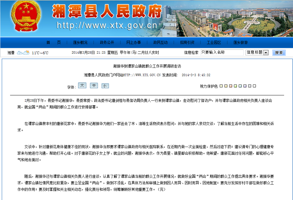 Posted: 29 Mar 2014 12:22 AM PDT (谢书记真神奇,一袋米加一桶油瓦解了唐新花“两会”去北京) (喉舌铺天盖地宣传,如此低成本高效率党亡不了了) ——湖南唐新花致湖南省委书记徐守盛的一封信 徐书记,您好! 我是唐新花,今想向您反映一个虚假群众路线问题。今年2月28日,我们湘潭县县委谢振华书记、政法委唐剑红书记等领导到我家走访,帮助解决问题:一.针对我的身体状况安排谭家山政府周东林书记衔接医院,帮我对症治病;二.小孩读书学杂费给予照顾;三.帮小孩安排工作等。但是到目前为止,这些问题都没有解决,反而在湘潭县电视新闻频道、红网、报纸上刊登,大肆报道,作为领导体恤民众的宣传手段。难道这是作为领导的该有的行径吗? 今特请求徐书记查实处理这件事,谢谢您!呈报人:唐新花 唐新花,湖南省湘潭县谭家山镇人。1996年因计划生育结扎手术造成严重的后遗症,身心受到严重摧残,得不到应该的赔偿,上访上诉近十八年,遭地方政府干部长期打击和迫害,多次遭到曹令、杨韧、谢正其等人毒打,被夜深人静时扔在衡山白果山冲里,无数次软禁,三次拘留(30天),两次劳教共计三年等,生不如死,含冤悲惨。 习近平主席上台,强调要走群众路线,解决上访的疑难复杂的积案,想不到县委书记的群众路线如此低成本高效率。 唐新花电话:15616734289. 此信息由权利运动公民权利项目编辑 |
