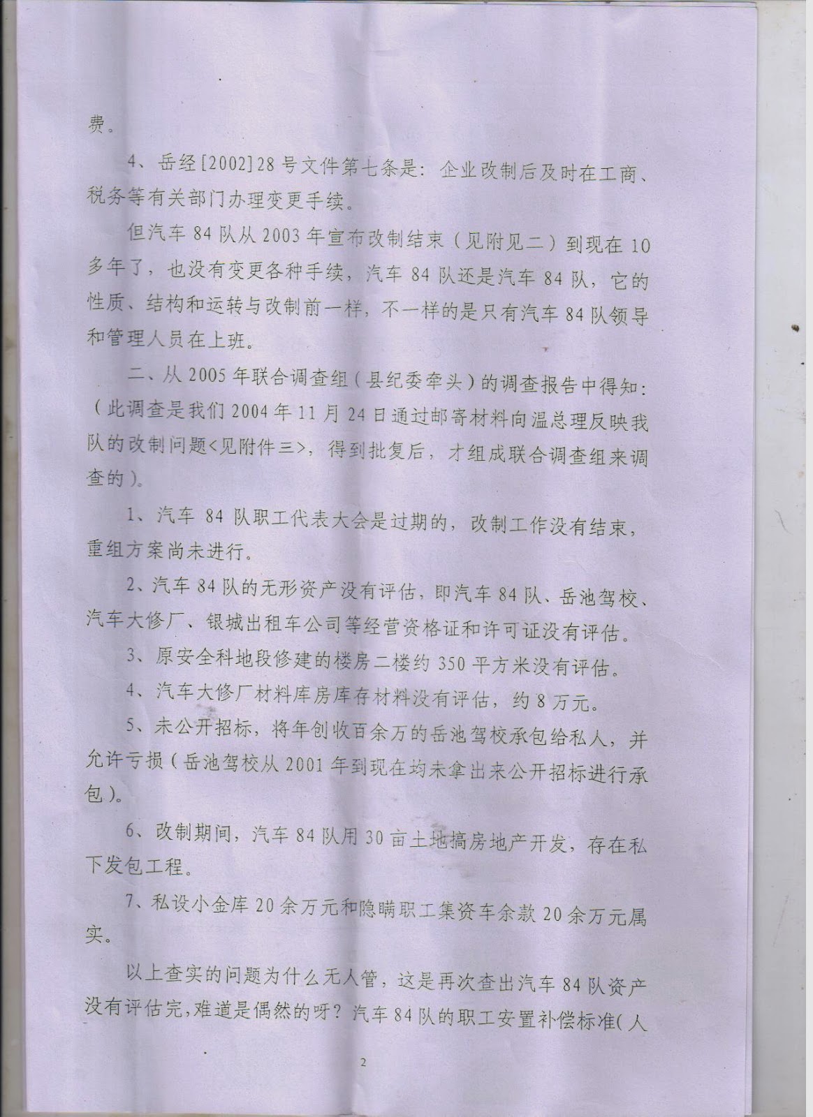 Posted: 27 Mar 2014 04:56 PM PDT 我们是四川省汽车运输第84队职工(地址岳池县),反映该队在改制工作中存在的严重问题,这些问题曾无数次口头和书面向各级政府及政府领导反映,至今未得到解决。为了维护职工的合法权益,确保国有资产不流失,迫于无奈,特继续向您们呼吁: 一、汽车84队的改制工作没有按改制文件执行。(见附件一) 1、岳经体改【2002】28号文件第一条是:原则同意四川省汽车运输第84队解体重组为股份制企业的产权制度改革方案。但事实是汽车84队的改制一没有解体,二没有重组,三没有进行产权制度改革。 2、岳经体改【2002】28号文件第三条是:搞好企业资产评估以及债权债务,各种历史遗留问题的处理。 但汽车84队在进行财务审计和资产评估时,法人没有离任审计,均是由该队法人一手操作,造成资产没有评估完。并且没有将拖欠待岗职工在待岗期间的基本生活费和职工集资车余款纳入改制中统筹解决。 3、岳经体改【2002】28号文件第四条是:搞好职工安置方案的编制(职工安置另文批复),在职工安置中可按照自愿的原则,采取买断工龄自谋职业,也可带资入股,使企业转变性质,职工转变身份。 但汽车84队在改制工作中根本没有按照此规定执行,而是采取各种手段强迫职工买断工龄自谋职业。从汽车84队宣布改制结束后,县交通局和汽车84队领导就内定了50余人留下继续上班(全队在职职工人数共284人),这些人就是汽车84队的领导层和管理人员,并且他们没有领取买断工龄自谋职业的安置补偿费。而我们不愿意买断工龄自谋职业的职工,汽车84队一不让我们带资入股,二不让我们上班,三不给我们缴纳社保费和发基本生活费。 4、岳经体改【2002】28号文件第七条是:企业改制后及时在工商、税务等有关部门办理变更手续。 但汽车84队从2003年宣布改制结束(见附见二)到现在10多年了,也没有变更各种手续,汽车84队还是汽车84队,它的性质、结构和运转与改制前一样,不一样的是只有汽车84队领导和管理人员在上班。 二、从2005年联合调查组(县纪委牵头)的调查报告中得知:(此调查是我们2004年11月24日通过邮寄材料向温总理反映我队的改制问题〈见附件三〉,得到批复后,才组成联合调查组来调查的)。 1、汽车84队职工代表大会是过期的,改制工作没有结束,重组方案尚未进行。2、汽车84队的无形资产没有评估,即汽车84队、岳池驾校、汽车大修厂、银城出租车公司等经营资格证和许可证没有评估。 3、原安全科地段修建的楼房二楼约350平方米没有评估。 4、汽车大修厂材料库房库存材料没有评估,约8万元。 5、未公开招标,将年创收百余万的岳池驾校承包给私人,并允许亏损(岳池驾校从2001年到现在均未拿出来公开招标进行承包)。 6、改制期间,汽车84队用30亩土地搞房地产开发,存在私下发包工程。 7、私设小金库20余万元和隐瞒职工集资车余款20余万元属实。 以上查实的问题为什么无人管?这是再次查出汽车84队资产没有评估完,难道是偶然的吗?汽车84队的职工安置补偿标准(人均8千元)本来就没有达到国家规定的安置补偿标准,这些没有评估的资产不拿来用于职工安置又留给谁呢?这几年我们一直不间断地向县委、县府领导及上级有关部门反映这些问题,可就是无人来纠正和处理,这是为什么? 综上所述,汽车84队的改制工作,没有按照政府的改制政策贯彻执行。违反了川汽运84队字〔2002〕17号(见附件四)、岳经体改【2002】28号文件和国务院《关于规范国有企业改制工作的意见》(见附件五)的文件精神,侵犯了职工的合法权益。 目前,岳池县交通局已将汽车84队所有资产转移到了岳池康顺运业有限公司(约伍仟多万元,固定资产二千多万元(见附件六),无形资产价值二千多万元),而我们反映的上述问题无人来解决和纠正,还是按2002年的84队所谓的改制文件执行, 人均8000元,无任何其它费用。2003年到2014年的十年间,我们未了断劳动关系的职工的社保费和待岗工资也不管,也不让我们上班,只是强迫我们了断劳动关系(见附件七和八)。真是想不到啊,从黑发人上访到白发人,都解决不了我们的问题,确实是天高皇帝远,一个小小的汽车84队的改制工作,竟敢凌驾于党纪国法之上。与党的联系群众的教育实践活动唱反调。 为了维护职工的合法权益和党纪国法的尊严,我们在走投无路的情况下,强烈要求你们调查核实,予以依法纠正和处理。 四川省岳池汽车八十四队未解决劳动合同的职工 唐云刚(电话15884941312)、陈军(电话13208221188)、周洪武(电话15982618079)、尹昌勇(电话15282680361)、关存荣(电话15284969776)、黄清(电话15982617757)、杨涛(电话15182021631)、程孝全(电话13982699013)、曹代成、贺大柱、王兵、杨其涛、王兴贵、吴家福、杨玉奎、唐自力、李特、杨卫东等 |