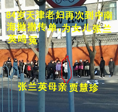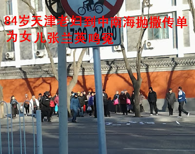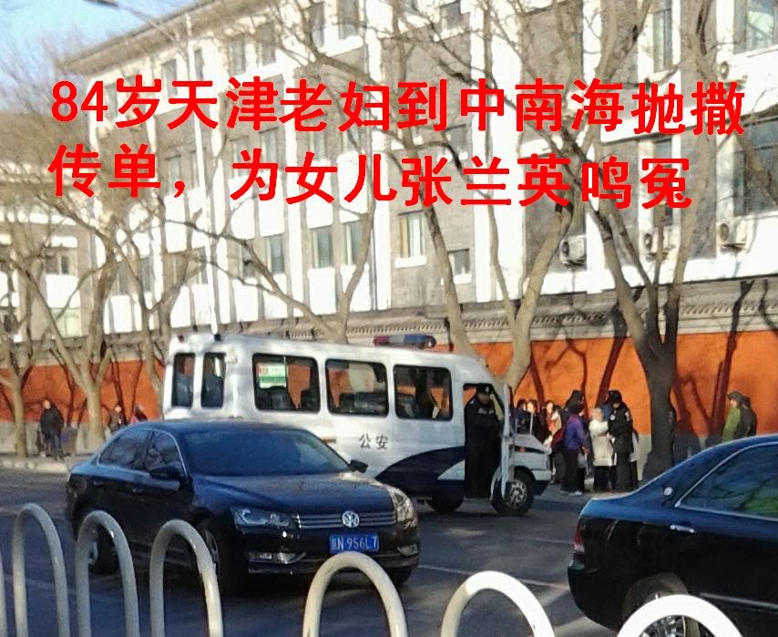 Posted: 12 Dec 2013 07:55 AM PST (2013/12/12)权利运动发布: 今天(12月12日)下午,84岁天津老太贾惠珍来到中南海红墙撒传单,为失去家园、失去家庭、失去健康的女儿张兰英鸣冤。目前,老人被维稳警察带走下落不明。 其女儿张兰英,中共党员,建设银行天津分行中层干部。2011年8月11日遭非法强拆,到京反映,被天津南开区政府绑架回津关黑监狱,不堪凌辱下被逼割腕自杀。由于政府不积极治疗,导致终生残疾。单位建设银行打压逼迫,致使其离婚。至今家毁人残的张兰英和年迈的老人仍在南开区政府犯罪第二现场时代宾馆103室,无人管,无人问。 全国访民近日汇聚中南海,向最高层鸣冤,希望中共中央能够听到、看到血泪冤情,切实解决问题。今天同去的全国访民还有河北著名维权人赵春红、陕西吕动力、大庆张宝珠、香港维权人韩素华等。 此信息由权利运动紧急热线项目编辑 |