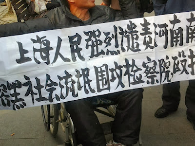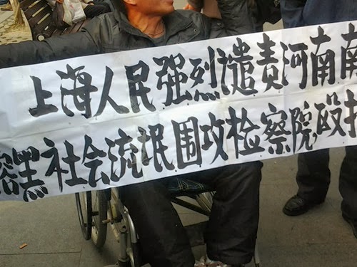 Posted: 18 Dec 2013 02:10 AM PST (2013/12/18)权利运动发布: 今天上午,知名维权人士肖青山与500百多深受司法腐败坑害的上海访民在人民广场互动,然而转战上海市黄浦区法院。一路上,肖青山举着以独特的肖氏书法撰写的“推翻专制独裁、还我司法独立”横幅让民众驻足观望,这样的横幅敏感而又让大家感到亲切,就连上海市的警车也跟在后面,为说出中国人民愿望的肖青山保驾护航。 在司法独立的国家和地区,虽然还不能让每一个公民感受到司法的公平正义,但在司法不独立的国家和地区,司法零公正是必然!司法也必然是统治者的私法!这样司法也必然是统治者犯下累累罪行后逃避制裁的挡箭牌! 所以,民众、宪政、法制、人权已经深入人心,绝不会以任何怀着阴暗心理的人的意志所转移。 周雪珍电话:15921781034。 肖青山电话:18979645473.徐佩玲电话:13601934872。 此信息由权利运动司法公正观察项目编辑 |
