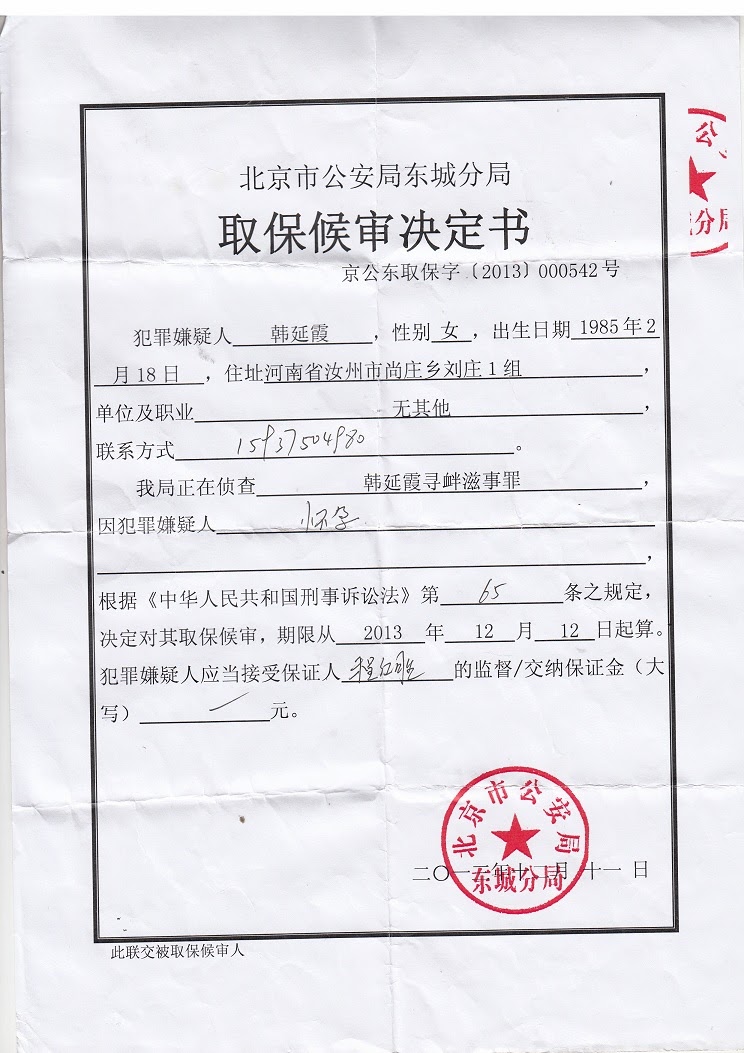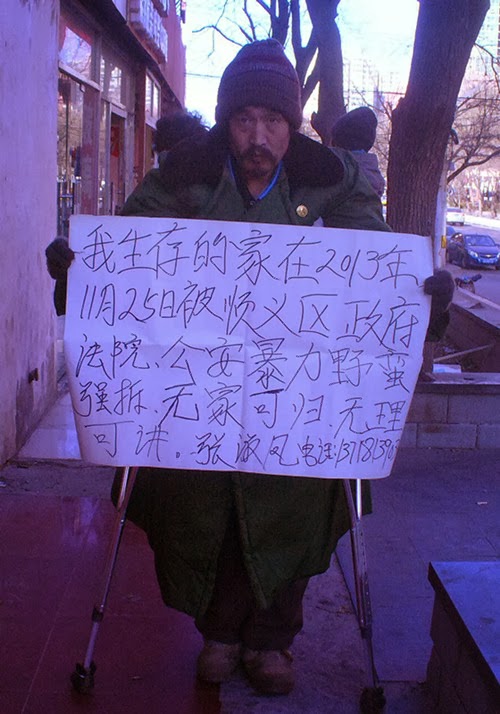 Posted: 03 Jan 2014 04:36 PM PST (2014/1/3)权利运动发布: 今天上午,北京市顺义区仁和镇前进村的被强拆难民张淑凤出拘留所,发现同被拘留10天的残疾丈夫张德利没有出拘留所,后由派出所副所长肖志国告知在顺义区中医院。张淑凤到中医院后,发现丈夫的身上有伤痕,且说话颠三倒四,就与肖志国等人理论。 在与肖志国理论中,肖志国告诉张淑凤:是主管房屋拆迁的顺义区付区长赵桂恒不给你们房子的,与我没有关系。在拘留所双双受到暴力伤害的夫妇俩只能相互搀扶,赶往中共中央的办公地点中南海,请求习近平总书记还自己的居住权。由于张德利身穿状衣,又有顺义区仁和镇的警察与保安一路尾随,夫妇俩在天安门被警察截住带到东华门派出所。 仁和镇的警察张旭华与保安、伪村长张中杰的外甥周洋见东华门派出所为自己打下手,就在下午18点与东华门派出所的弟兄们外出吃饭。一小时多后,酒足饭饱的张旭华与弟兄们回了派出所。张淑凤告诉张旭华:自己与残疾人丈夫张德利一天没有吃饭了,应习近平邀请到要到庆丰包子铺,享受皇家点心肉包子。 据张淑凤反映,自己出拘留所发现,有400元人民币被侵吞。而张德利在2013年12月29日送民航总医院抢救,第二天(30日)转顺义区中医院,本来还需要继续治疗,但公安拒绝支付医疗费。 截稿时,张德利、张淑凤夫妇正在前往中南海,希望习近平能代表党和政府还自己的住房权利,而张旭华等人尾随在后,伺机阻截。 张淑凤电话:13718139034. 此信息由权利运动紧急热线项目编辑 |