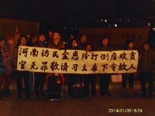 Posted: 08 Jan 2014 04:29 AM PST (2014/1/8)权利运动发布: 今天下午,全国各地的访民代表30余人到西城区的庆丰包子铺,打出“习总吃饱鸣天下,冤民捡饭无人问”,以及习近平十八大报告的“凡是损害群众利益的做法都坚决防止与纠正”的条幅。结果,辖区的维稳警察以“落实习近平报告”为由,将参加今天活动的辽宁大连访民栾德升抓走,其中警号为024642、024653、023417的三个警察还对丁灵杰实施抢夺,抢走数码相机与手机各一部。, 自从习近平到庆丰包子铺秀了一回亲民后,这庆丰包子铺就成为了国家信访局,要成为了访民想实现中国梦的绝杀器!一个个炒肝味没闻到,包子没吃成,就都被没心肝的维稳警察送到马家楼吃包子他爹——硬如铁的馒头去了。 截稿时,以浙江金华农嫁女何竹青、季来娟等发起的维权群体、以及辽宁沈阳残疾访民侯美华等,陪同丁灵杰到西城区公安分局阜成门派出所交涉,要求停止与纠正损害访民权益的不法行为。 侯美华电话:18511019907. 何竹青电话:18072698887.此信息由权利运动公民权利项目编辑 |