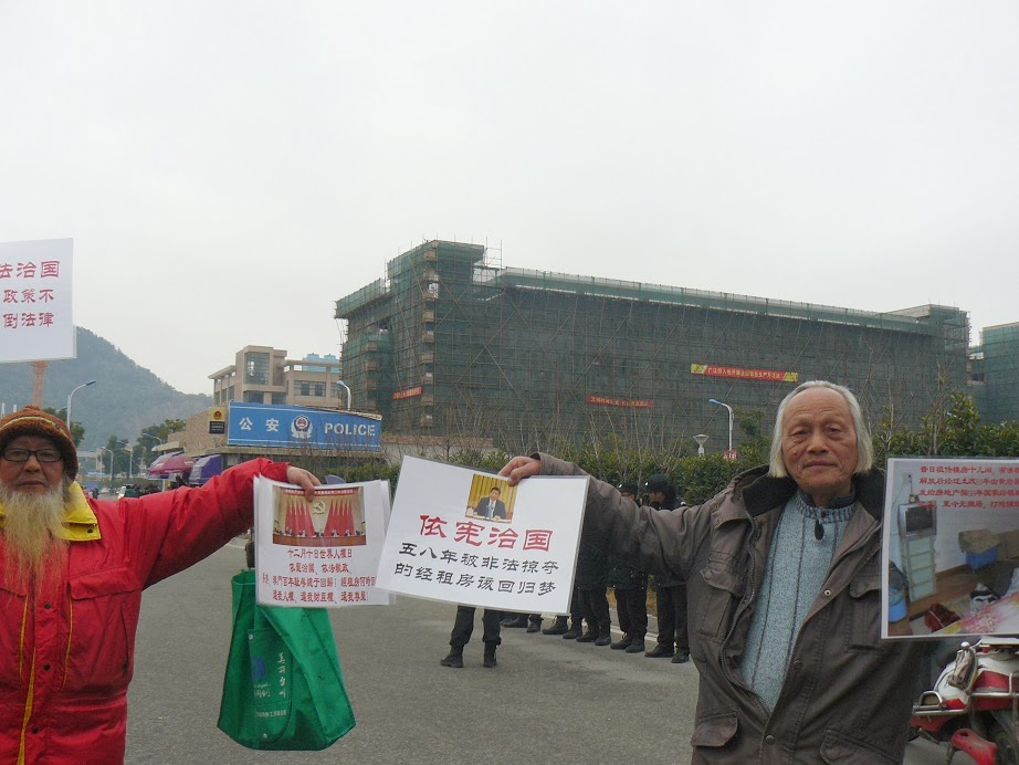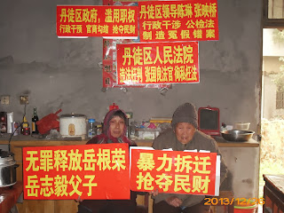 儿孙抵御狼狗抢劫队遭重判,镇江85岁老党员找市委书记被挡门外 Posted: 02 Jan 2014 04:21 PM PST (眼睛已被打瞎的85岁老党员被阻在市委大楼外) (2014/1/2)权利运动发布: 今天是2014年元月2日,新的一年的第一个工作日。上午10点,今年已经85岁的老党员谢顺英,在儿媳妇谈荣庆、孙女岳志敏的陪同下,到江苏省镇江市市委、市政府大楼,为遭构陷重判的儿子岳根荣、孙子岳志毅鸣冤,要求见市委书记杨省世,结果被信访局以“司法问题归中院负责”为由不予受理。 2012年12月18日上午,镇江市丹徒区政府派出公安牵着狼狗,协同房产开发商所雇佣社会人员,杀气腾腾来到丹徒区新城光明社区岳巷53号居民岳根荣房屋前,不仅推倒了岳根荣房屋前的5亩地油菜、1500颗桃树,还在岳根荣房屋旁边强行深挖。因为挖土机的深度破坏,导致门前的两口水井被填埋,家中彻底被断水、断电、断出进的通路。 据了解,岳根荣家的土地至今没有得到一分钱的征收补偿安置,也没有看到开发商使用土地的合法手续。按照国家的相关法律法规,征收农民土地必须给予农民补偿后才可以使用土地,否则一律不允许施工建设。 为了抵御房产商及政府蓄意的侵占与破坏行为,据说岳根荣、岳志毅父子俩向参与破坏的黑社会人员扔了用烟花爆竹捆绑的汽油瓶,以试图阻止非法抢地与破坏房屋的不法行为,结果父子俩不仅被打伤,还被公安以“涉嫌爆炸罪”为由刑事拘留,直至被批捕、起诉。 镇江市公安局丹徒区分局之所以将燃烧物当作爆炸物,对岳根荣、岳志毅父子俩进行构陷,主要是因为岳根荣在当地有一定的维权影响,目的就是在帮助开发商获取不法利益的同时,又在民众中造成恐怖气氛。 2013年12月11日下午,江苏省镇江市丹徒区法院以“爆炸罪”重判岳根荣、岳志毅父子俩各三年徒刑,引起到庭旁听50余位民众的一片哗然。民众纷纷议论:要知道用鞭炮吓阻一下非法入侵的黑社会被如此重判,还不如象苏州的范木根那样轰轰烈烈把政府雇佣的黑社会给宰了。 目前,该案已经上诉到镇江市中级法院,由家属重新聘请刘晓原律师与李静林律师作为岳根荣、岳志毅父子俩的辩护人。 岳志敏电话:13179490186. 此信息由权利运动司法公正观察项目编辑 |