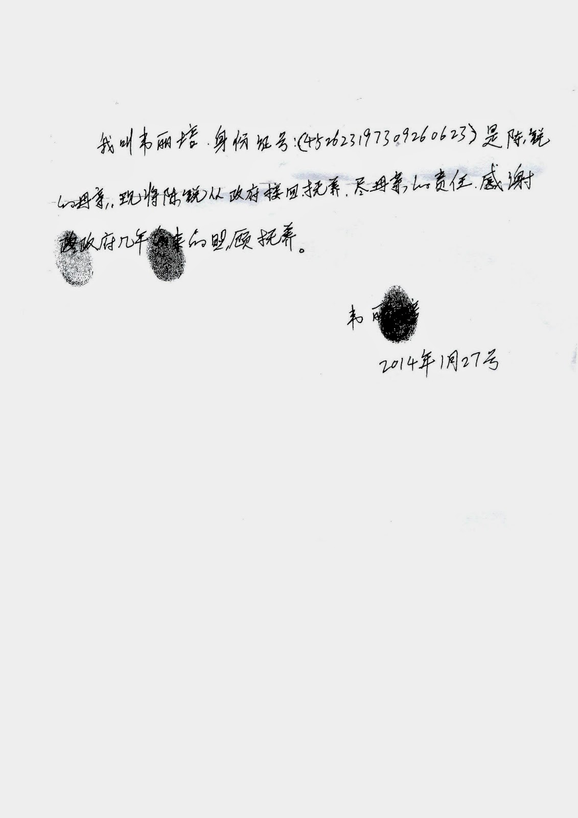 Posted: 05 Apr 2014 04:04 AM PDT (将陈呀写成陈锐,世上哪有母亲写错儿子名字) (2014/4/5)权利运动发布:昨天(4月4日)上午,广东珠海市金湾区三灶镇政府信防办主任谭志福、三灶镇党委刘委员、三灶镇中心村书记关锦超仨人,在保安的保驾护航下,将一张由韦丽培手书的“接回儿子陈锐、并感谢政府几年来照顾抚养”、落款日期为2014年1月27日的复印件,交给了伤残军人陈风强的哥哥陈份明手中, 韦丽培是伤残军人、知名维权人士陈风强的女友,广西百色田东县人。2009年,韦丽培因为拍摄珠海当局绑架陈风强的视频而一直被失踪,而其残疾儿子陈呀就这样被留在了珠海。陈风强遭到当局司法迫害判刑后,陈风强与前妻所生的两个未成年孩子与陈呀被非法囚禁,导致三个未成年孩子失去上学的权利,尤其是刚刚5岁的陈呀,丧失了因脑瘫的最佳康复治疗,留下了终身的严重肢体残疾。 为了阻止伤残军人陈风强维权,当局在2013年8月10日将陈风强实施绑架,第二天(8月11日)中午由金湾区治安队的张国辉带领一帮歹徒绑走陈呀,然而由公安以“遗弃罪”对伤残军人陈风强实施刑拘,并移交检察院逮捕、起诉。 韦丽培怎么会将丧心病狂残害自己年幼儿子陈呀的当局当作恩人,并在手书感谢政府几年来照顾收养呢?从该复印件中陈呀被写成陈锐就可以看出,要么该纸条是当局伪造、要么是韦丽培在胁迫下所写!世上哪有母亲将儿子的名字写错的道理? 当局此时出示该涉嫌伪造的纸条,很有可能与当局准备再次迫害伤残军人陈风强有关。据陈风强委托的人权律师刘晓原说,他日前刚刚接到金湾区法院的电话通知,称4月16日将公开开庭审理陈风强的遗弃罪。 刘晓原律师说:表面是遗弃罪,实际与遗弃没有利害关系,是要将伤残军人陈风强作为头号稳控对象剥夺其人身自由而已。 陈凤明电话:13612220596. 此信息由权利运动紧急热线项目编辑 |
