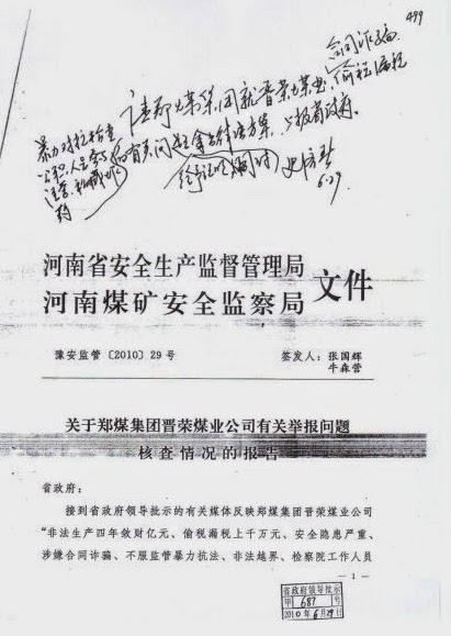 Posted: 08 Apr 2014 05:52 PM PDT ——关于原河南省副省长史济春、监察厅执法监察室主任付华延滥用职权、越权代庖的举报材料 (史济春滥用职权的证据之一) 举报人:郑州煤炭工业(集团)晋荣煤业有限公司的股东戴丽娟等。被举报人:史济春,男,中共党员,河南省统战部长,原任河南省副省长,主管煤炭工业与安全生产。 被举报人:付华延,女,河南省监察厅执法监察室主任,系史济春之妻。 我们是郑州煤炭工业(集团)晋荣煤业有限公司的股东,现实名举报河南省统战部长史济春在担任河南省副省长期间与其妻子付华延以权谋私、滥用职权、越权代庖、助纣为虐等违法犯罪事实,恳请中央纪委、监察部逐项调查,以正党纪国法和领导干部的形象。 举报事实与理由 郑州煤炭工业(集团)晋荣煤业有限公司的煤矿位于河南省郑州市二七区马寨镇梨园河村北。2005年梨园河二矿与郑煤集团进行资源整合成立郑州煤炭工业(集团)晋荣煤业有限公司,井田面积2.2km2,资源储量380万吨,现煤矿价值1.94亿元,年设计生产能力30万吨,当年取得合法的采矿许可证等及批复文件。2007年1月22日,省煤炭管理局干部闫济道以投资为名与我矿股东签订《股份转让协议》,协议约定:闫济道出资1800万元,占30%的股份,但闫济道仅支付760多万元后就不再继续投资。闫济道为了实现他最终霸占我们煤矿的目地,以各种手段破坏煤矿技改工作,导致技改工程停工长达10个月,造成巨大的经济损失。我们股东顶着闫济道的破坏不得不借钱继续技改,2009年4月16日,郑煤集团批准我矿进入联合试运转。 2009年5月22日,闫济道看到我们矿技改完成,就和其子闫森一起带领刘香志、董立秋、闫圣伟、杨大伟等曾被公安机关处理过的涉黑人员等300多人手持砍刀强行霸占公司的餐厅、磅房、门卫室,不准矿工下井、阻止任何人进出煤矿大门。7月27日,闫济道和闫森再次指使涉黑人员统一手戴白手套并手持大砍刀和钢管,砍伤、打伤我矿8名职工。 我们向河南省政法委写信举报后,在省政法委李新民书记的批示下,郑州市公安局二七分局经过调查大量走访取证,确定这是一起由涉黑人员纠集、采取打砸抢等手段,以非法霸占公司产业为目的的刑事犯罪行为。于是,二七公安分局将闫济道等58名犯罪分子抓捕,闫森闻风潜逃后被网上通缉。2008年12月29日,二七区人民法院以聚众扰乱社会秩序罪判处闫济道等有期徒刑三年。 闫济道在被依法追究刑事责任后,不是悔罪自省,而是向时任河南省副省长的史济春和其老婆付华延大肆行贿。 史济春和付华延夫妻二人经不起闫济道的“糖衣炮弹”而接受巨额贿赂后,即开始置党纪国法于不顾,多次滥用职权违法批示、越俎代庖炮制虚假报告,诬陷我矿为非法生产。 史济春四次批示,要求严查合法经营的企业。 1、史济春第一次批示。2009年12月29日,由省安委会牵头组织省安监局、煤监局、工信厅、发改委、国资委、国土资源厅、公安厅等7部门参与联合调查小组,对晋荣煤矿进行调查取证。最终,联合调查组形成调查结论:晋荣煤矿没有非法生产(《豫安委办[2010]1号文件》)。 2、史济春第二次批示。2010年6月5日,由省煤矿安全监察局、省安全生产监督管理局组成的联合小组,查处晋荣煤矿,调查报告证明:晋荣煤矿没有非法生产(《豫安监管[2010]29号》)。 3、史济春第三次批示。2010年8月31日,郑煤集团公司组成调查小组查处晋荣煤矿,结果同样是:晋荣煤矿没有非法生产。 4、史济春第四次批示。看到三次调查的结论都是晋荣煤矿没有非法生产,2010年史济春让其夫人付华延组织调查组,以省监察厅的名义越权代庖调查我们矿“非法生产”。 付华延越权代庖、滥用职权炮制虚假报告。 1、付华延指令省监察厅执法监察室调查组编造虚假报告省监察厅执法监察室调查组在付华延的授意下,根本没到我们矿进行调查,更没与我矿股东见面。即2010年9月15日至30日凭空编造了一份虚假的《豫监[2010]13号文件》。 2、付华延滥用职权且越权调查。 《行政监察法》第二条规定,监察机关只能依法对国家行政机关及其公务员和国家行政机关任命的其他人员实施监察,而不具有对煤矿安全生产监督管理的职权,我矿不是国家行政机关,没有公务员,更没有行贿受贿行为,所以,省监察厅不具备对我矿行使监察的权利,所以,监察厅对我们矿的调查完全是越权代庖。2011年6月3日,二七区人民政府2011年第5次常务会议二七政会纪[2011]32号纪要:……坚决贯彻落实史济春副省长的批示精神,立即启动晋荣煤矿关闭工作,于2月27日成立了二七区关闭晋荣煤矿工作指挥部。2011年5月31日,二七区政府下达关闭晋荣煤矿决定书。 因为史济春、付华延夫妇的滥用职权、越权调查和违法报告,导致我们已达到试运转将要投产的煤矿无法生产,只能通风排水,史济春、付华延夫妇违法乱纪的行为给我们矿造成经济损失上亿元。2012年,《中华工商时报》2012年4月24日以《郑煤集团民营股东股份转让缘何陷泥淖》、《民主与法制》2012年第14期以《晋荣煤矿关闭背后的矿权资源之争》对此相继报道。 因不懂煤炭行业的安全生产管理,史济春在担任主管工业的河南省副省长期间,由于其玩忽职守最终造成煤矿恶性事故频发,仅2009年9月至2010年8月一年,河南省煤矿共死亡206名矿工:(1)、2009年9月8日,平顶山新华四矿发生瓦斯爆炸事故,死亡79人;(2)、2010年3月15日,