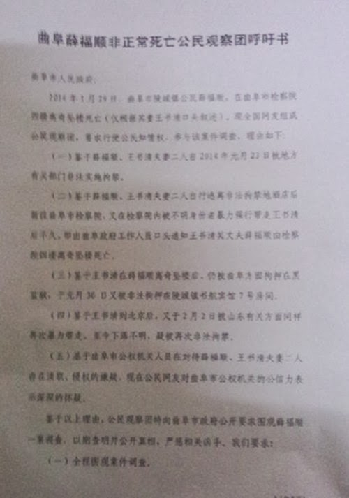 Posted: 02 Feb 2014 08:07 AM PST ——公民权利关注组部分成员就薛明凯父亲薛福顺非正常死亡的声明