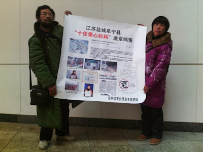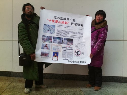 Posted: 20 Jan 2014 12:01 AM PST (汪静[右]与祁从咬夫妇在天安门) (2014/1/20)权利运动发布:因为举报土地问题的江苏省阜宁县爱心妈妈汪静,在遭到一系列打击报复与构陷迫害后,于2014年1月12日抵达北京,到国家信访局、最高法院、全国妇联等部门伸冤。然而,汪静今天接到儿子电话,称自己已经被控制在阜宁县司法局,杨局长找其谈话,如果妈妈继续在北京伸冤,就要对自己收监。 其实,在接到儿子电话的前一天,就有朋友提醒汪静:县委政法委书记吴晓飞召集公、检、法、司紧急开会,说汪静与另一位因举报贪腐而被构陷坐牢的人大代表祁从咬在北京到处举牌揭露阜宁腐败的真相,决定以其儿子作为要挟的筹码,逼迫其乖乖地回家,然而再次给予打击。 被阜宁当局以“妨害作证罪”判刑一年的汪静女士,是一位在江苏省内具有一定知名度的爱心妈妈。汪静曾经收养两位被遗弃的残疾女婴作为自己的女儿,而且还多方求治,将先天就患白内障的大养女儿治愈。阜宁当局为了迫害举报土地问题的汪静,不惜将汪静收养的未成年女儿绑架,然而诬陷汪静有虐待行为。当江苏电视台调查后发现,村民对汪静照顾两个养女,无不交口称赞:亲生儿子也没有这么细心!遂以“少女出走之迷”为题,对腐败的阜宁当局予以曝光。 一计不成,阜宁当局又生一计,开始设计陷害汪静的儿子,先是在网上对尚未成年的汪静儿子搞虚假的通缉、抓捕、劳教等的黑材料,导致其儿子到福州武警部队服役后被退回。2012年8月15日凌晨,汪静的儿子刘智峰接到李志杰、田海洋、孙兵等玩伴的电话,到阜宁县向阳路见面,看到李志杰、田海洋、孙兵拿着两台笔记本电脑。此后,阜宁公安以同爱劳务出国门市内两台笔记本电脑被盗为由(价值3190元人民币),抓捕了汪静的儿子,并以汪静为了替儿子开脱罪责,在儿子取保候审时期唆使儿子翻供,并指使李志杰、田海洋作伪证为由,以“妨害作证罪”对汪静判刑一年。 汪静坚持认为,儿子并没有参与盗窃,儿子被判缓刑完全是栽赃陷害,目前既是打击报复自己,也是一箭双雕控制自己伸冤。而这一次儿子根本不知道自己进京伸冤,况且儿子与其父亲在一起生活,控制儿子完全是株连九族行为。 株连九族是封建政治制度的一大特征,汪静伸冤儿子遭株连这一事实,将被喉舌喻为宇宙真理的社会主义特色制度给彻底露底了。 汪 静电话:13141318797. 祁从咬电话:13651573568。此信息由权利运动紧急热线项目编辑 |