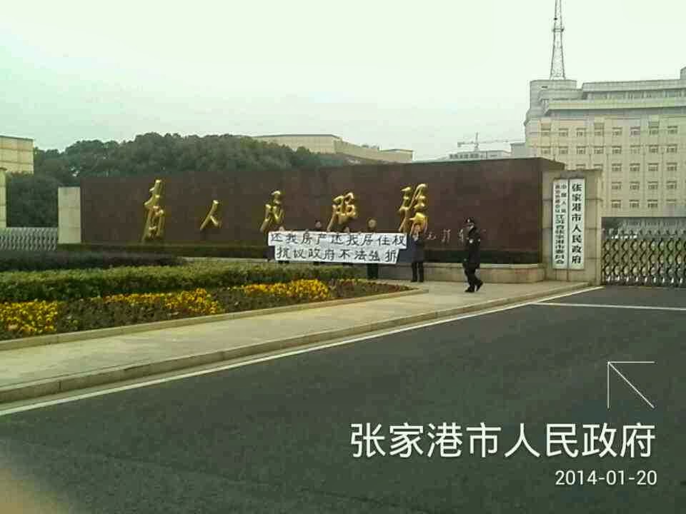 Posted: 20 Jan 2014 04:43 PM PST (“贞节牌坊”后面尽是损害百姓利益的负资产) (腐败党死翘翘,习近平的忧虑不无道理) (2014/1/20)权利运动发布:今天上午,江苏省张家港市城南街道的徐勤芬、钱樱母女,郭祖良、徐翠莲夫妇,宋艳萍、蒋仁达夫妇一行六人,为了房屋拆迁的问题一直得不到合理合法的解决在市政府门口拉“要求还我房产、还我居住权”横幅,抗议杨舍镇政府勾结黑社会强拆自己房屋的不法行为,要求市政府依法解决问题。 徐勤芬、郭祖良、宋艳萍三户被强拆居民原属于杨舍镇,其私有房屋在现张家港市的市中心繁华步行街区,一直对外出租,不仅每年有不菲的收益,也照章向国家纳税。 2009年4月13日,张家港当局看中了老百姓房屋上的土地,以“小城河改造项目”为名(实为曼巴特商业广场),由建设局非法发放“房屋拆迁许可证”予张家港市土地储备中心,对徐勤芬、郭祖良、宋艳萍所在小城河地块的78户居民实施房屋拆迁。“房屋拆迁许可证”上载明,由张家港市台力房屋拆迁公司与金泰房屋拆迁公司接受土地储备中心的委托,具体实施房屋拆迁。 按照《城市房屋拆迁管理条例》的规定,曼巴特商业广场的房屋拆迁人是张家港市土地储备中心、及其受委托的房屋拆迁公司,也就是说有房屋拆迁人或受其委托的房屋拆迁公司与拆迁地块居民依照房地产市场价格进行协商补偿安置。但,当局为了不法利益最大化,居然安排有黑社会背景把持的杨舍镇政府对居民实施掠夺式的暴力强拆,将同类型房地产市场价格超过4万元每平米的居民强行安置到2公里之外的中港花苑,还美其名曰拆一还一不损害老百姓权益。 徐勤芬、郭祖良、宋艳萍三户居民,是在地方政府非法强拆三年后依然在坚持依法维权的仅剩三户居民,其家庭成员都遭到当局的株连,正常的工作被调动与停止。例如宋艳萍的女婿戴建,2008年考取省招村官;先后在斜桥村、范庄村任书记助理,并在2012年被评为张家港市十佳村官;2013年5月1日调至杨舍镇纪委监察科办事员。2013年10月12日,杨舍镇的三盲信访办主任杨建平提出戴建协助维稳工作,在没有任何调令的情况下,将其调往杨舍镇城西街道龙潭社区,说是做岳父母的房屋拆迁的思想工作,而当戴建于10月14日去城西街道上班时,却被龙潭社区主任告知社区无空位,至今被架空在家中。 (同意被流氓共产,才能够恢复工作) 见被强拆居民要求依法解决问题,张家港市政府大楼里面的保安与警察慌忙出来维稳,将大家带到张家港市信访局大厅,由信访局的一个姓周的副局长接待了大家,但说了点不着边际的扯蛋话就走了。大家在信访大厅等了半天,却等来了杨舍镇的三盲信访主任杨建平等人,大家就上楼找到了信访局另外一个副局长邵继东,问:强拆已经第四的年头了,老百姓怎么生活?看来在邵副局长也是强拆的得益人,居然要大家服从非法安置,并支付差额。 面对政府官员借经济发展实施的抢劫与压榨,今天到市政府的讨说法未果被强拆难民表示,在中共不反腐就一定死翘翘的大趋势下,大家一定会坚持依法维权到底。 此信息由权利运动紧急热线项目编辑 |