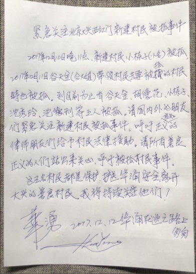 Posted: 17 Dec 2017 07:43 PM PST 维权网: 如果揭示真相的华涌有罪,我们愿与他同罪! 人权艺术家华涌因深入北京大兴区实地拍摄、记录当局清除“低端人口”的残暴画面并公开传出,遭到警方追捕。12月15日夜晚10点半左右,华涌被北京警察跨省于天津一李姓朋友家中抓走。 危急关头华涌在被捕前为女儿唱生日快乐歌! 他在视频中告诉女儿:“爸爸这样做是为了你们这一代人,不要再经历爸爸和爷爷经历过的事情,爸爸想要我们国家好起来,应该公正、公平、自由、民主、言论自由,我们人人都敢在大庭广众下、阳光灿烂下大声说真话,这是我为这个国家做的贡献。我愿用我的肉身、用我的躯体,去捍卫一个公民说真话的权利,一个公民做人的权利。女儿,爸爸爱你!爸爸爱你!生日快乐!” 他呼吁:“中国人该站起来了” 他认为:为了孩子,为了做人的权利,为了说真话,遇见什么都是值得的! 今天早上,当我在网上看到多日来一直传说人权艺术家华涌因拍摄报道北京政府违背民意,公然采用极端暴力(公寓断水断电,使用棍棒打砸民房、店铺窗户,驱赶百姓于冰天雪地中等)强制驱赶所谓低端人口真相,旨在揭露侵犯公民生存、健康、自由选择劳作栖息的权利,而遭遇官方追捕。 然而由于近日北京驱赶低端人口的行动好像半途夭折。如果是由于北京官方处于舆论的压力,民众本能的抵抗,认识到自己的政策确实违法损害了百姓的基本人权,并进行了及时纠错,停止暴行。如果并非不得已而为之,那么,第一个站出来勇于播报真相警示官方的华涌,理应受到官方的表彰,而非反其道而行之,施行秋后算账,抓捕打压说真话的华涌! 华涌被抓,我泪流不止!我流泪并非我担心华勇后续的遭遇,因为这是在魔鬼世界里说真话就必须付出的代价!这是华涌自己的选择,是他自己该承受的,是他为我们、为我们的子孙后代自愿承受的! 我流泪,是因为我要告别一个小市民的幻想,更坚定地誓死践行中国人权观察不回头!我自愿听从华涌的呼召:“中国人该站起来了”! 揭示真相无罪!华涌无罪!如政府判华涌有罪,我们愿与他同罪! 2017年12月16日 起誓人: 中国独立人权观察员徐秦13331102551 上海公民徐佩玲18121439381 |