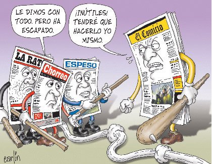 En una de las entrevistas a Humala, Raúl Tola espetó al candidato de Gana Perú: “Diga usted si Chávez es dictador o no”. Pero nunca le pidió a Keiko que dijera si su padre fue ladrón y criminal o no. No puede pedir eso a quien representa los intereses que defiende este periodista que funge de pulcro e independiente. Las diferencias entre ambos candidatos, desde el punto de vista de los intereses del país, son claras, pero para Tola no. Humala es el cuco que se debe espantar. Keiko es la posibilidad esperada para que ciertos periodistas sigan manteniendo sus privilegiados ingresos, pues estos dependen de la publicidad que contratan las grandes empresas en cada uno de los grandes medios y más sintonizados programas de radio y TV. Como Keiko Fujimori seguirá defendiendo el mismo programa económico, su apoyo está cantado por los dueños de los medios, pues su triunfo mejorará los ingresos de los empresarios, por tanto, habrá más dinero para la publicidad y un porcentaje mayor de ganancias para los productores y conductores de programas. Este es el contenido real de la libertad de prensa que defienden los periodistas fujimontesinistas.