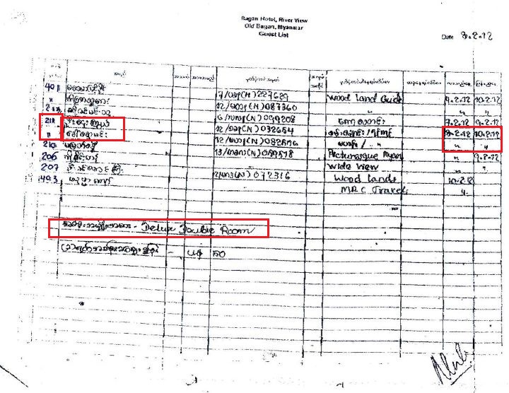 ၈၈ မ်ိဳးဆက္ ေက်ာင္းသားေခါင္းေဆာင္ ေဌးႂကြယ္နဲ႔ NLD ဇမၺဴသီရိအမတ္ေလာင္း စႏၵာမင္းတို႔ ပုဂံခရီးစဥ္အေၾကာင္း ဓာတ္ပံုတင္လိုက္ေတာ့ သက္ေသမရွိဘူးဆိုၿပီး comment ေတြ ေရးခဲ့ၾကတယ္။ အခု ပုဂံဟိုတယ္က ၈-၂-၁၂ ရက္ေန႔ ဧည့္စာရင္းကို ကူးၿပီး အားလံုးသိေအာင္ တင္ေပးလိုက္ပါတယ္။ ဦးေဌးႂကြယ္၊ ေဒၚစႏၵာမင္း အခန္းအမွတ္ ၂၁၁ မွာ ၈-၂-၁၂ ရက္ေန႔ကေန ၁၀-၂-၁၂ ရက္ေန႔အထိ တည္းခဲ့တယ္။ တစ္ခန္းတည္း ေနခဲ့တယ္ဆိုတာ လက္ဆုပ္လက္ကိုင္ ေတြ႕ရပါၿပီ။ မွတ္ပံုတင္နံပါတ္ေတြ ပါတယ္။ မွန္/မမွန္ စစ္ပါ။ စႏၵာမင္းရဲ႕ ေယာက်ာ္း ဗိုလ္ႀကီးေဟာင္း ေမာင္ေမာင္ သိရင္ ဘာေျပာမလဲလို႔ စဥ္းစားမိပါတယ္။