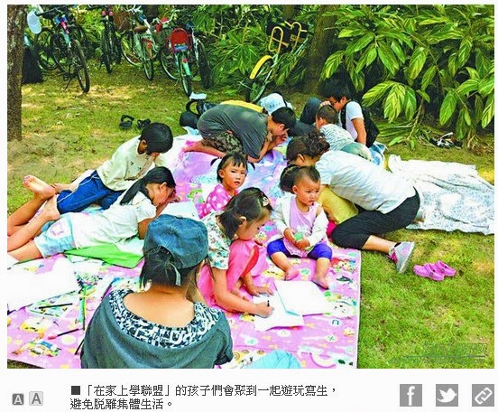 名兒童的家長獨闢蹊徑,他們將孩子從學校接回來「在家上學」,讓子女擺脫學校的功課與考 試壓力。這些家長表示,他們不滿學校片面強調升學率,孩子因競爭而被過早抹煞純真的天性,也有人擔心現有的學校教育會給孩子「洗腦」。