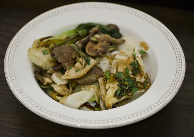 I wasn’t planning on blogging again so soon (it being finals and all)- but my current procrastination is a testament to how amazing this is. You should probably make it for dinner right now. The recipe is from the latest Bon Appétit, but I’ve made a few minor changes: I added mushrooms and onions and I omitted the sake (didn’t want to make an extra stop at the liquor store- stupid Massachusetts laws). But I think the sake would be very delicious- will try next time.