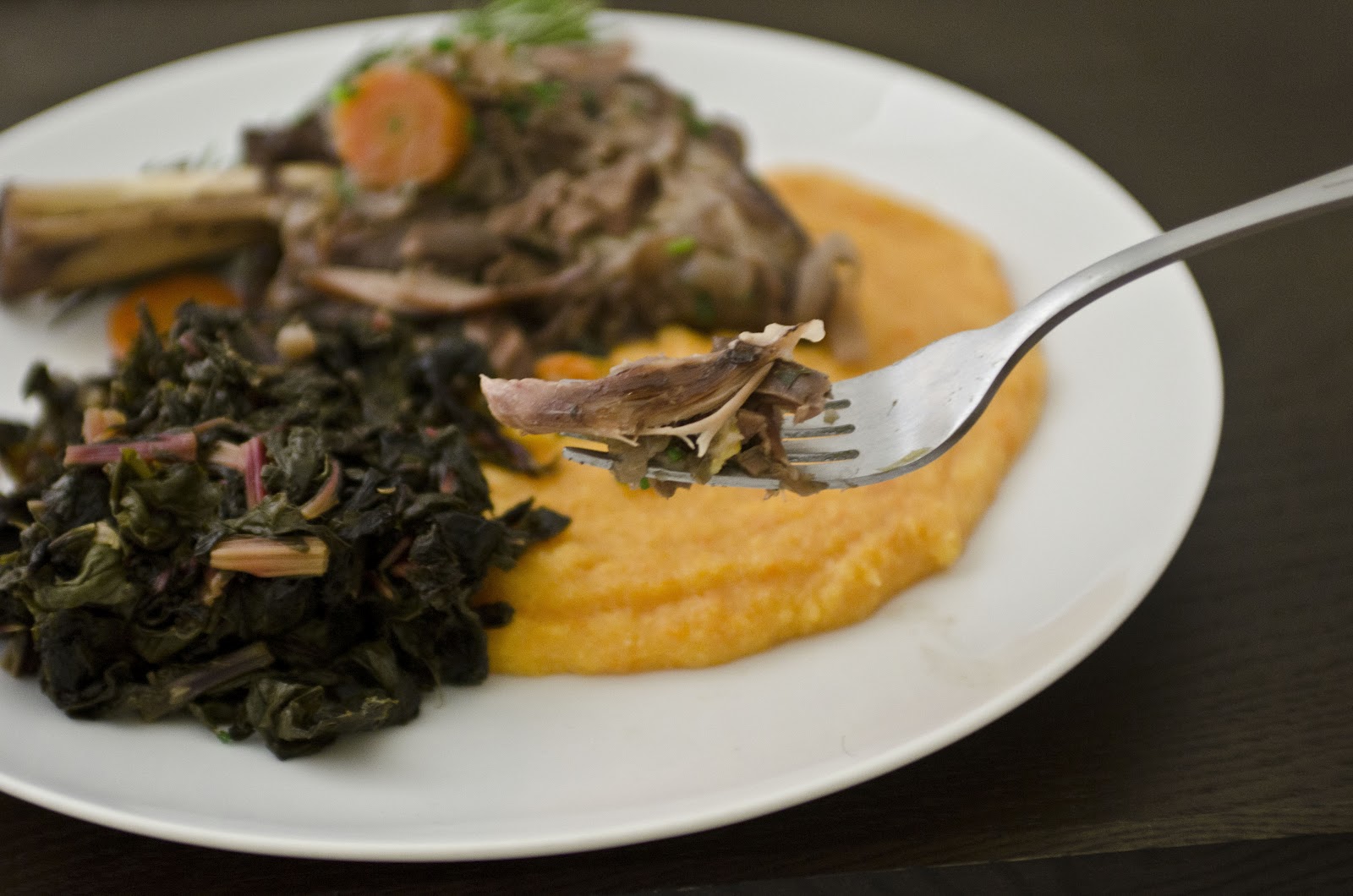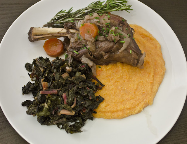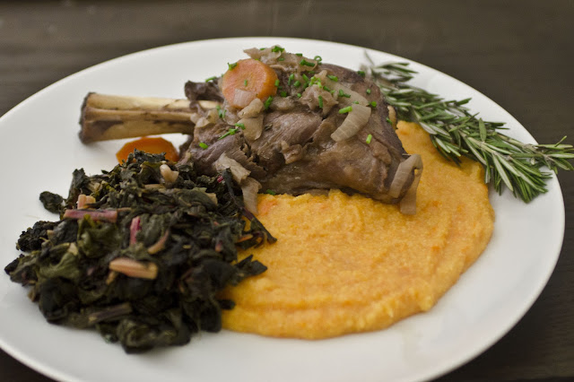 Poke the sweet potato with a fork in a few places, then wrap it in foil and throw it in the oven with the lamb. Let it cook for about an hour, or until it feels soft. Remove from oven and let cool. Meanwhile, cook polenta according to box directions. Cut the potato in half, scoop out insides, then mash with a fork. Add the sweet potato to the polenta and season to taste.