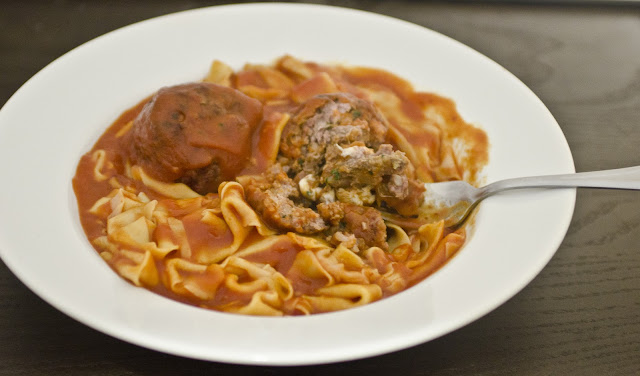 So we find ourselves in February. Freezing things. Things like meatballs stuffed with mozzarella! Yes, just when you thought meatballs couldn’t get any better, Thomas Keller swoops in like a genius and puts gooey cheese in the middle of them. Of course, being the perfectionist that he is, TK recommends that you grind all of the meat yourself. But don’t worry, the recipe I have posted below is for those of us who don’t own our own meat grinders. I served them with papardelle and the