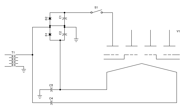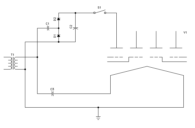 This uses one 18 microfarad capacitor instead of two 35 microfarad ones, which is nice. I used a different version of the voltage doubler for the anode/grid supply too, but this seems like it ought to work.
