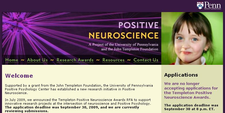 今天突然想到积极神经科学这个词,网上一搜。很巧,就在今年8月份,宾夕法尼亚大学建立了Templeton积极神经科学奖,用于鼓励神经科学与积极心理学的交叉研究。