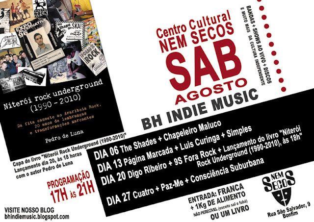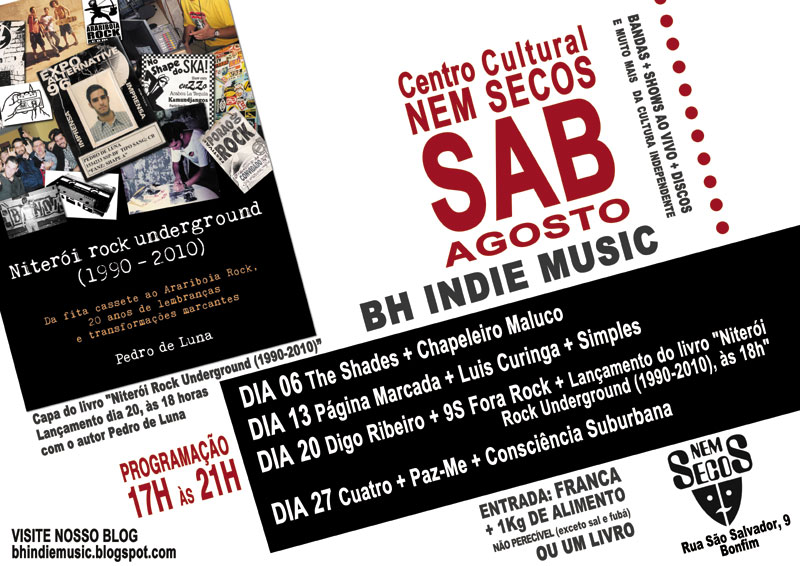 BH INDIE MUSIC NO CENTRO CULTURAL NEM SECOS Todos os sábados, à partir das 5 da tarde, bandas, tribos, discos, discotecagem e tudo o que comporta o universo da cena independente de música agitarão o Centro Cultural Nem Secos.