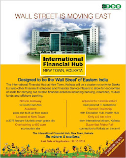 "The West Bengal Housing Infrastructure Development Corporation (WBHIDCO), a Government of West Bengal Undertaking, is currently developing an International Financial Hub spread over a 25 acre cluster (in the first phase), the first of its kind in Eastern India at New Town, Kolkata. A major step towards the economic development of the region, the International Financial Hub will be fully equipted to attract the banks/financial institutions whose participation will place the State firmly on the global business map. The foundation stone of the International Financial Hub will be laid at a high profile event slated sometime in the second week of March 2012. The event will attract participation from top bankers and leaders in the financial/business arena besides leading political and film personalities."