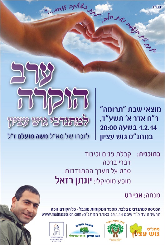 מתנדבי גוש עציון מוזמנים לערב הוקרה שיערך במוצאי שבת 'תרומה', ר"ח אדר א' 1.2.14 בשעה 20:00 במתנ"ס גוש עציון.