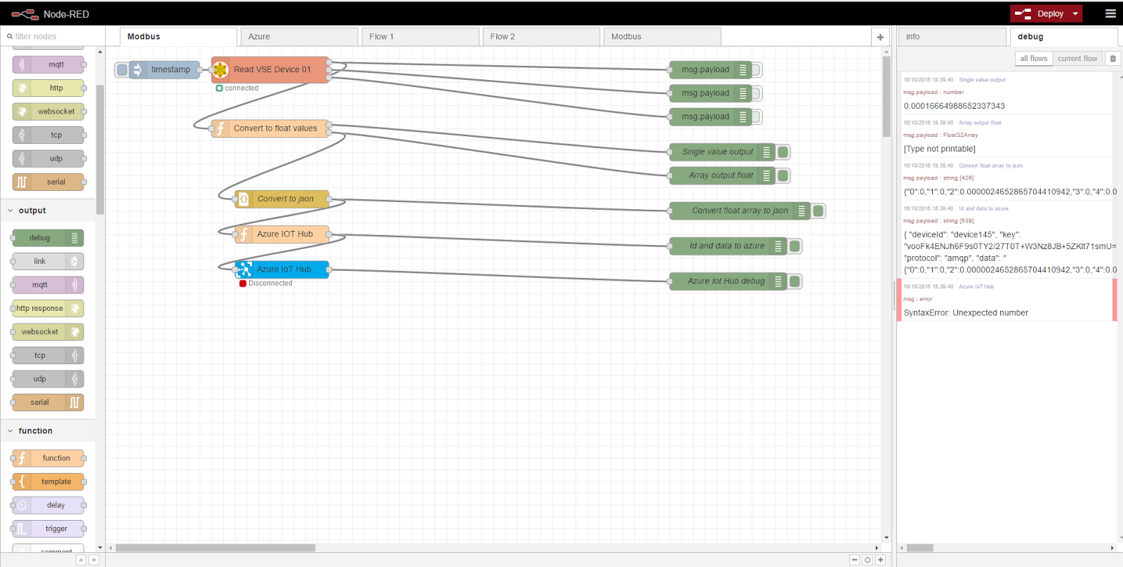 [{"id":"2a5c9c2a.54c284","type":"tab","label":"Modbus"},{"id":"690190fd.4805c","type":"modbus-getter","z":"2a5c9c2a.54c284","name":"Read VSE Device 01","dataType":"HoldingRegister","adr":"0","quantity":"80","server":"2f99874b.476318","x":280,"y":40,"wires":[["fdb011af.ae881","c7c0994c.f66548"],["e287bfd5.14206"],["479453bb.a8256c"]]},{"id":"ed051b69.a82bb8","type":"inject","z":"2a5c9c2a.54c284","name":"","topic":"","payload":"","payloadType":"date","repeat":"","crontab":"","once":false,"x":100,"y":40,"wires":[["690190fd.4805c"]]},{"id":"fdb011af.ae881","type":"debug","z":"2a5c9c2a.54c284","name":"","active":false,"console":"false","complete":"false","x":1030,"y":40,"wires":[]},{"id":"e287bfd5.14206","type":"debug","z":"2a5c9c2a.54c284","name":"","active":false,"console":"false","complete":"false","x":1030,"y":80,"wires":[]},{"id":"479453bb.a8256c","type":"debug","z":"2a5c9c2a.54c284","name":"","active":false,"console":"false","complete":"false","x":1030,"y":120,"wires":[]},{"id":"c7c0994c.f66548","type":"function","z":"2a5c9c2a.54c284","name":"Convert to float values","func":"// Thx to Dave C-J \nvar msg1;\nvar msg2;\nvar ui16 = new Uint16Array(msg.payload);\nvar fl32 = new Float32Array(ui16.buffer, ui16.byteOffset, ui16.byteLength / Float32Array.BYTES_PER_ELEMENT);\n msg1 = {payload: fl32[4]};\n msg2 = {payload: fl32};\nreturn [msg1,msg2];\n","outputs":"2","noerr":0,"x":280,"y":140,"wires":[["3a38c0af.56fbd"],["4d8b3e4b.ad6a6","a3d868a7.030a58"]]},{"id":"3a38c0af.56fbd","type":"debug","z":"2a5c9c2a.54c284","name":"Single value output","active":true,"console":"false","complete":"payload","x":1050,"y":180,"wires":[]},{"id":"4d8b3e4b.ad6a6","type":"debug","z":"2a5c9c2a.54c284","name":"Array output float","active":true,"console":"false","complete":"payload","x":1050,"y":220,"wires":[]},{"id":"15e3a202.2969de","type":"debug","z":"2a5c9c2a.54c284","name":"Convert float array to json","active":true,"console":"false","complete":"payload","x":1080,"y":280,"wires":[]},{"id":"a3d868a7.030a58","type":"json","z":"2a5c9c2a.54c284","name":"Convert to json","x":300,"y":260,"wires":[["15e3a202.2969de","8ca42ec0.97e73"]]},{"id":"8ca42ec0.97e73","type":"function","z":"2a5c9c2a.54c284","name":"Azure IOT Hub","func":"msg1 = '{ \"deviceId\": \"device145\", '\nmsg1 = msg1 + '\"key\": \"vooFk4ENJh6F9s0TY2/27T0T+W3Nz8JB+5ZKlt71smU=\", ' \nmsg1 = msg1 + '\"protocol\": \"amqp\", '\nmsg1 = msg1 + '\"data\": \"' + msg.payload + '\"}'\n\nnewMsg = { payload: msg1 };\nreturn newMsg;","outputs":1,"noerr":0,"x":300,"y":320,"wires":[["7892a31c.53674c","3b999763.bbd3f8"]]},{"id":"7892a31c.53674c","type":"debug","z":"2a5c9c2a.54c284","name":"Id and data to azure","active":true,"console":"false","complete":"payload","x":1060,"y":340,"wires":[]},{"id":"3b999763.bbd3f8","type":"azureiothub","z":"2a5c9c2a.54c284","name":"Azure IoT Hub","protocol":"amqp","x":300,"y":380,"wires":[["e0b88eba.04326"]]},{"id":"e0b88eba.04326","type":"debug","z":"2a5c9c2a.54c284","name":"Azure Iot Hub debug","active":true,"console":"false","complete":"payload","x":1060,"y":400,"wires":[]},{"id":"2f99874b.476318","type":"modbus-client","z":"","name":"VSE_001","clienttype":"tcp","tcpHost":"127.0.0.1","tcpPort":"1502","serialPort":"/dev/ttyS0","serialBaudrate":"9600","serialDatabits":"8","serialStopbits":"1","serialParity":"none","unit_id":"1","clientTimeout":"5000","reconnectTimeout":"5000"}]