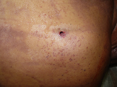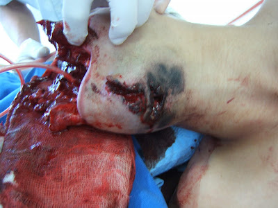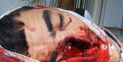 Note o orifício de entrada do projétil abaixo do queixo Tiro causou estragos na fenda palatina, língua, dentes e via oral