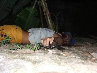 Zezinho tombou com a arma em punho O policial, então, revidou. Começou um rápido tiroteio. Em um momento oportuno, o agente resolveu entrar no imóvel, dando de cara com um dos suspeitos tombado. Das várias munições .40 deflagradas, uma delas atingiu em cheio a cabeça de Edson Nascimento da Fonseca, 18, conhecido como "Edinho". O jovem - futuro promissor no submundo do crime - foi extirpado da sociedade, antes do atendimento de primeiros socorros. Considerado um garoto "bom", principalmente para os familiares e "colegas de trabalho", Edinho ficou em silêncio absoluto, até a chegada do rabecão. Na mão direita, o fiel revólver calibre 38, usado em vários roubos, permanecia na mão direita. Os "manos" tiveram muita sorte