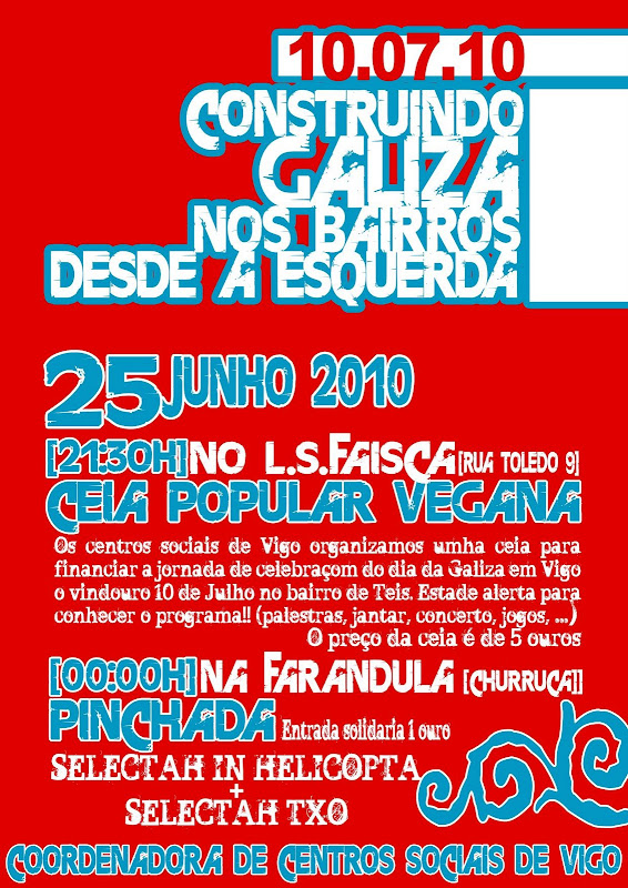 Nesta sexta-feira dia 25 de junho às 21h30 do serám a Coordenadora de Centros Sociais de Vigo (Faísca, Revolta, Guindastre, A Cova dos ratos e Semente Vermelha) organizamos umha ceia-convívio no Faísca com o objectivo de recadar fundos para a Jornada do dia da Galiza, que este ano celebraremos o dia 10 de julho no centro cívico de Teis (palestras, jantar, música ao vivo, jogos, ...) e na carvalheira da Guia (concertos). O preço do prato será o custo, sobre 5 euros, e depois quem puider e quiger pode fazer umha achega solidária. Apontade-vos nos centros sociais para fazer umha estimaçom de assistentes.
