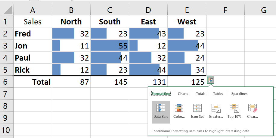 Select between the various options: Formatting, Charts, Totals, Tables and Sparklines to quickly analyze your data.