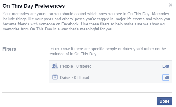 And that's it. Memories from the friends you've added to the People filter or dates you've added to the Dates filter will not be shown in On This Day.