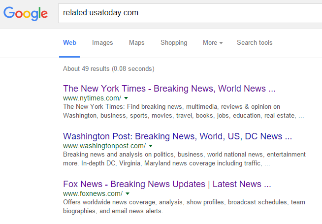 The search results returns pages within Google's database that link to this site. You can use the domain name or use the full URL for a page. 2. Find Sites That are Similar to a Site You'll find this to be a great search tip when using Google. Enter the domain name of a site and Google will return other sites that are similar. Use this when you want to discover other websites that provide similar information, products or services.