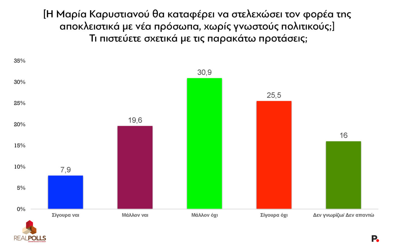 Το αν η κυρία Καρυστιανού θα καταφέρει να μετατρέψει τη δημοσκοπική δυναμική σε πολιτική πραγματικότητα, μένει να φανεί, καθώς, εκτός των άλλων, θα πρέπει να πείσει ένα 56% που αμφιβάλλει ότι μπορεί το κόμμα Καρυστιανού να στελεχωθεί χωρίς γνωστούς πολιτικούς (Πίνακας Χ) και επιπλέον να ικανοποιήσει ένα 85% που θέλει να γνωρίζει τα στελέχη πριν ψηφίσει (Πίνακας ΧΙ).
