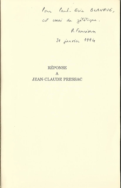 Faurisson avait lu un de mes articles de promotion zététique et m'avait envoyé en retour sa Réponse à Jean-Claude Pressac, opuscule auto-édité et dédicacé à mon nom comme « essai de zététique ». Plus personne ne se souvient de Pressac aujourd'hui : c'était un petit pharmacien de banlieue sans compétence holocaustique ni formation historique. Nazebroque honteux, il possédait à son domicile un buste d'Hitler placé en haut d’un escalier qui conduisait à une chambre insonorisée où il écoutait à pleins tubes de la musique militaire allemande. Il avait voulu travailler avec Faurisson, mais celui-ci l'avait refoulé. Depuis, Pressac lui vouait une haine tenace. C'était ce spécimen déliquescent qui était devenu en deux temps, trois mouvements le deus ex machina de la multinationale Klarsfeld and Co, qui allait enfin prouver au monde l'existence des chambres à gaz ! En France, le fruit de cette coalition nazioniste, aussi belle que « la rencontre fortuite sur une table de dissection d'une machine à coudre et d'un parapluie », comme eût dit Lautréamont, avait été la parution de son livre aux éditions CNRS sous le titre Les Crématoires d'Auschwitz. La Machinerie du meurtre de masse, dans lequel ne figurait ni photographie ni plan de chambre à gaz. Or personne n'avait bien entendu jamais nié l'existence des crématoires ! A lui seul le titre de l’ouvrage trahissait l’embarras de l’empoté potard.