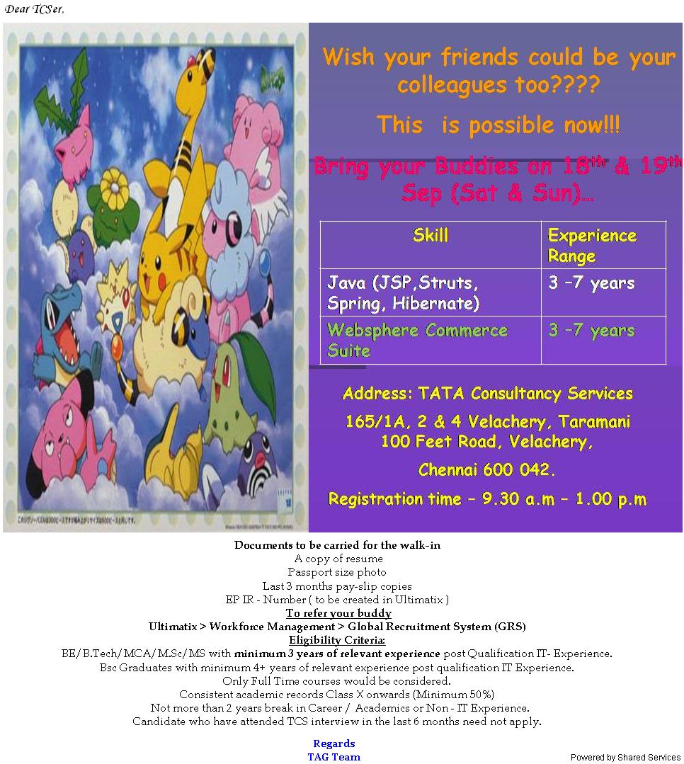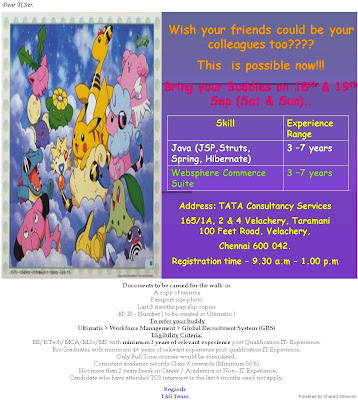 In case you have work experience in the above mentioned skill and meet the TCS Criteria (PFB) please walk in this "Sunday i.e. October 10th 2010" for a F2F interview.