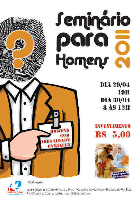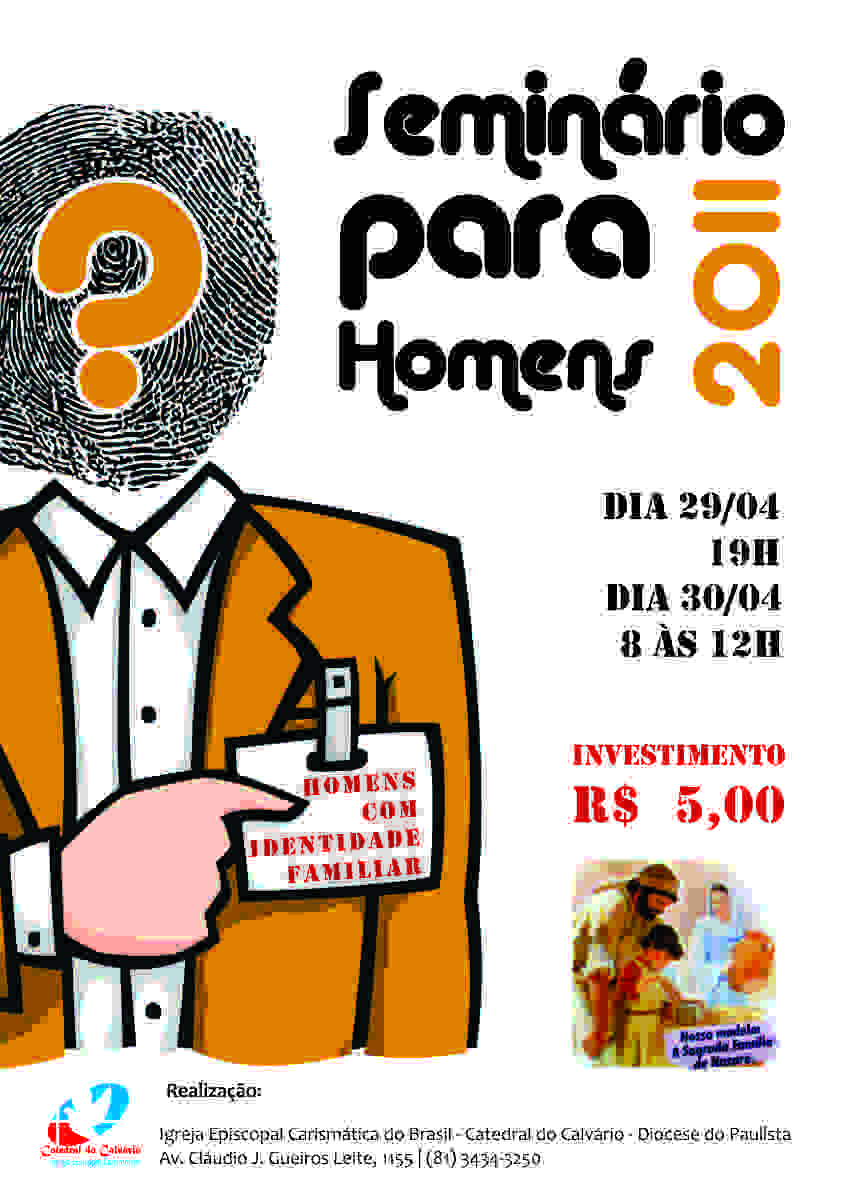 A IECB - Catedral do Calvário estará promovendo nos dias 29 e 30 de Abril o Seminário para Homens, com o tema Homens com Identidade Familiar. Investimento de R$ 5,00 (cinco reais)