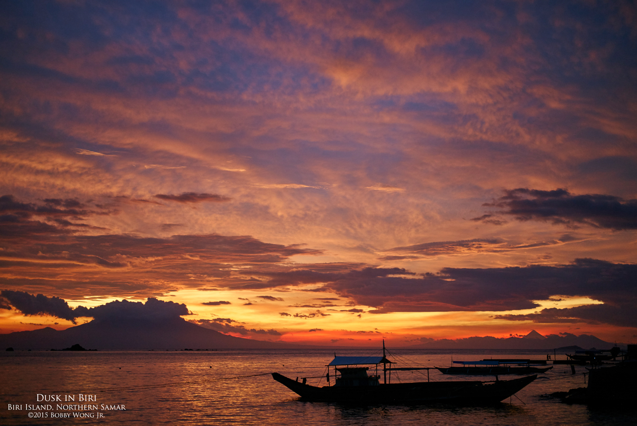 Last week, I shared a postcard I took in Virac Catanduanes, where Mount Mayon made a most unexpected appearance on the horizon. So while we're still on the topic of cameo appearances, today's postcard taken last year might be of interest.The story started at dusk on Biri Island in Northern Samar. But rather than sharing a photograph taken at peak light, when the heavens burned of crimson and vermillion, I chose to share one taken shortly after that, when the most intense colors have faded into a burnt orange. But why?It was only when the colors had faded, that the clouds parted to reveal an unexpected visitor on the horizon. Poised in grace, and peeking from the lower right hand side of my composition, is her majesty herself Mount Mayon. She had watched the entire spectacle with us from over 100 km away in Legaspi City! Now that's a record cameo in any book! Enjoy.(Pixel-peepers: Sometimes, the best photograph is the one with the best story.)