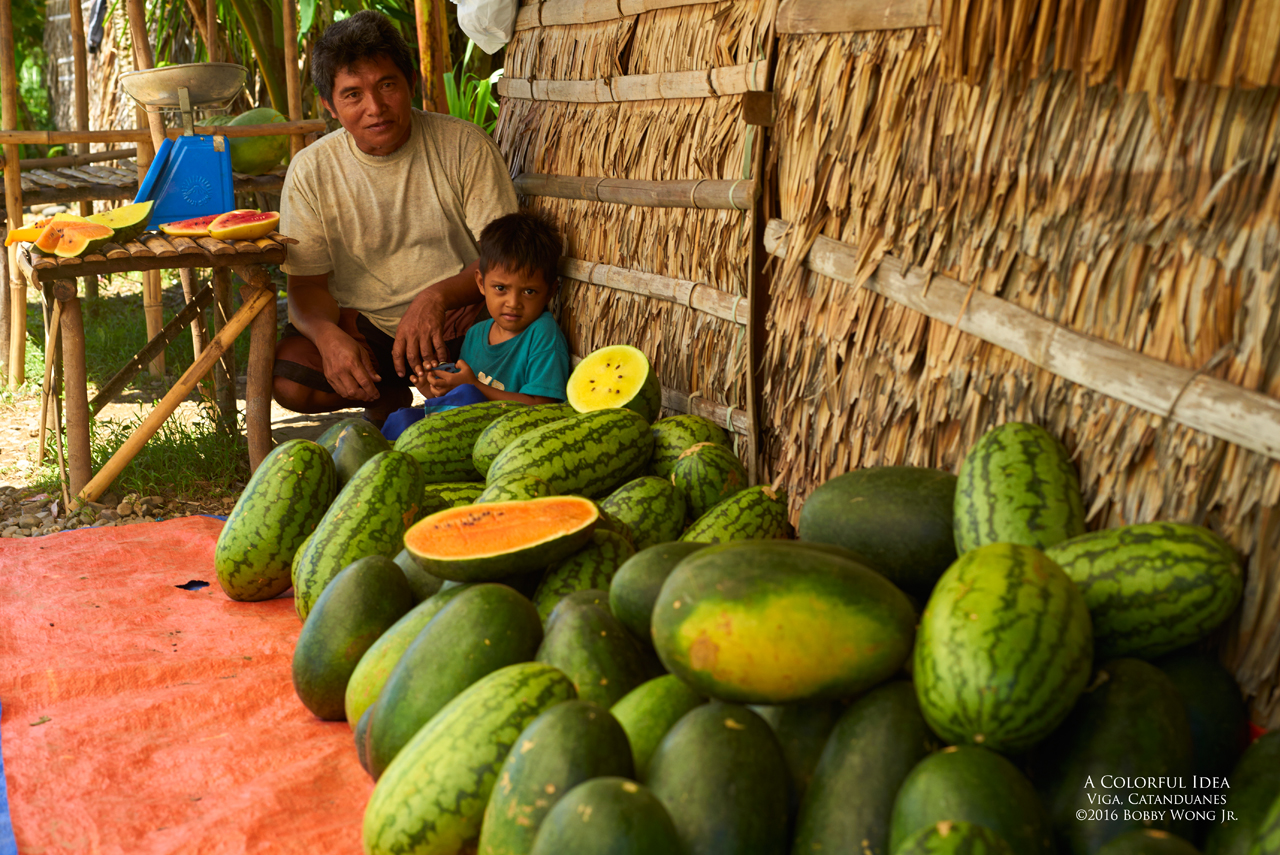 While combing the countryside for landscapes, we often run into interesting folks busy making a living. Photographing folks-at-work is of particular interest to us. Aside from the insight of how the rest of the country make ends meet, we feel certain some of these professions may disappear with the constant march of progress.Along the road in barangay Peñafrancia, just outside the municipality of Viga in Catanduanes, we chanced upon Oliver and his son Reymark. Oliver is a farmer who sought to differentiate himself by growing and peddling watermelon of several colors. We counted four: red, yellow, and two shades of orange, which in the noontime heat, were equally sweet and refreshing. Live long, watermelon farmers! Enjoy.(Pixel-peepers: We love taking landscapes, but it's the environmental portraits that we can't enough of.)