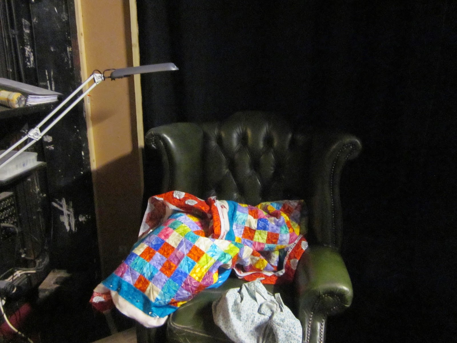 This is a tale of two chairs (well three to be precise...) The first is for stage manager Heather Noble. There are only two cast members in Not About Heroes and not much for the stage manager to do once the performance starts. Heather agreed to stage manage the show on the condition that she could have an armchair and her special light back stage so that she could do her crochet and quilting.