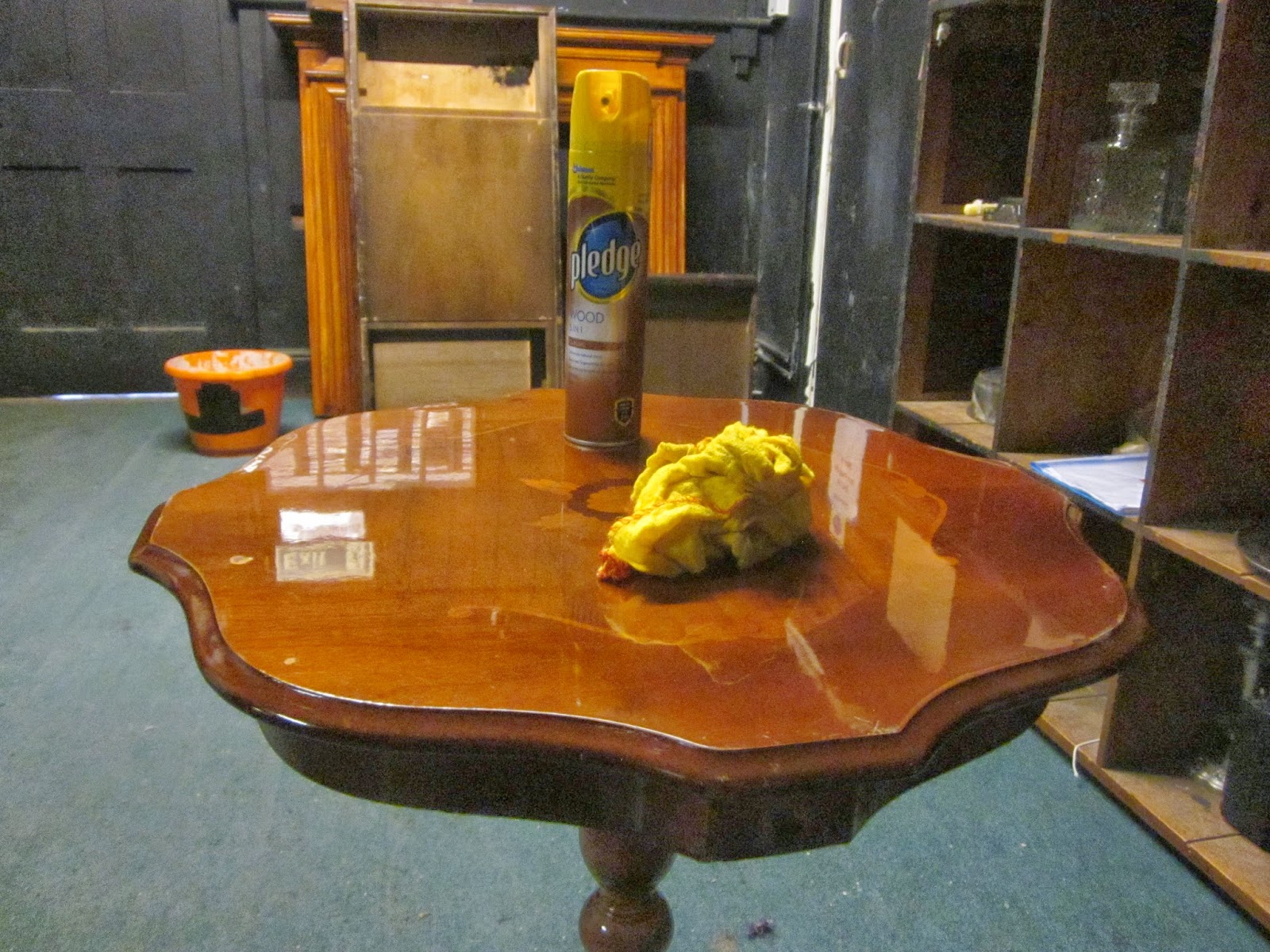The set is basically 'black box' with the interest coming from some beautiful pieces of furniture. Including this occasional table being treated to a good polish.