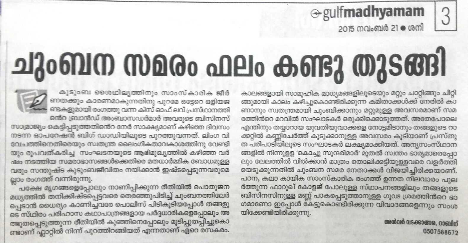 ലിംഗ വിവേചത്തിനെതിരെയും സ്വതന്ത്ര ലൈംഗികതാവകാശത്തിനു വേണ്ടിയും രൂപീകരിച്ച സംഘടനയുടെ ആഭിമുഖ്യത്തിൽ കഴിഞ്ഞ വര്ഷം നടത്തിയ ചുംബന സമരാഭാസങ്ങള്ക്കെതിരെ മതധാര്മ്മിക ബോധമുള്ളവരും സമാധാനപരവും സന്തുഷ്ടവുമായ കുടുംബജീവിതം നയിക്കാന് ഇഷ്ടപ്പെടുന്നവരുമെല്ലാം രംഗത്ത് വന്നിരുന്നു.